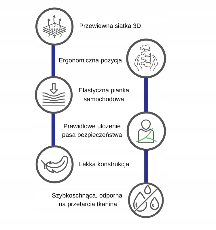 - Zagłówek z pianką absorbującą energię – dodatkowa ochrona głowy w razie zderzenia.