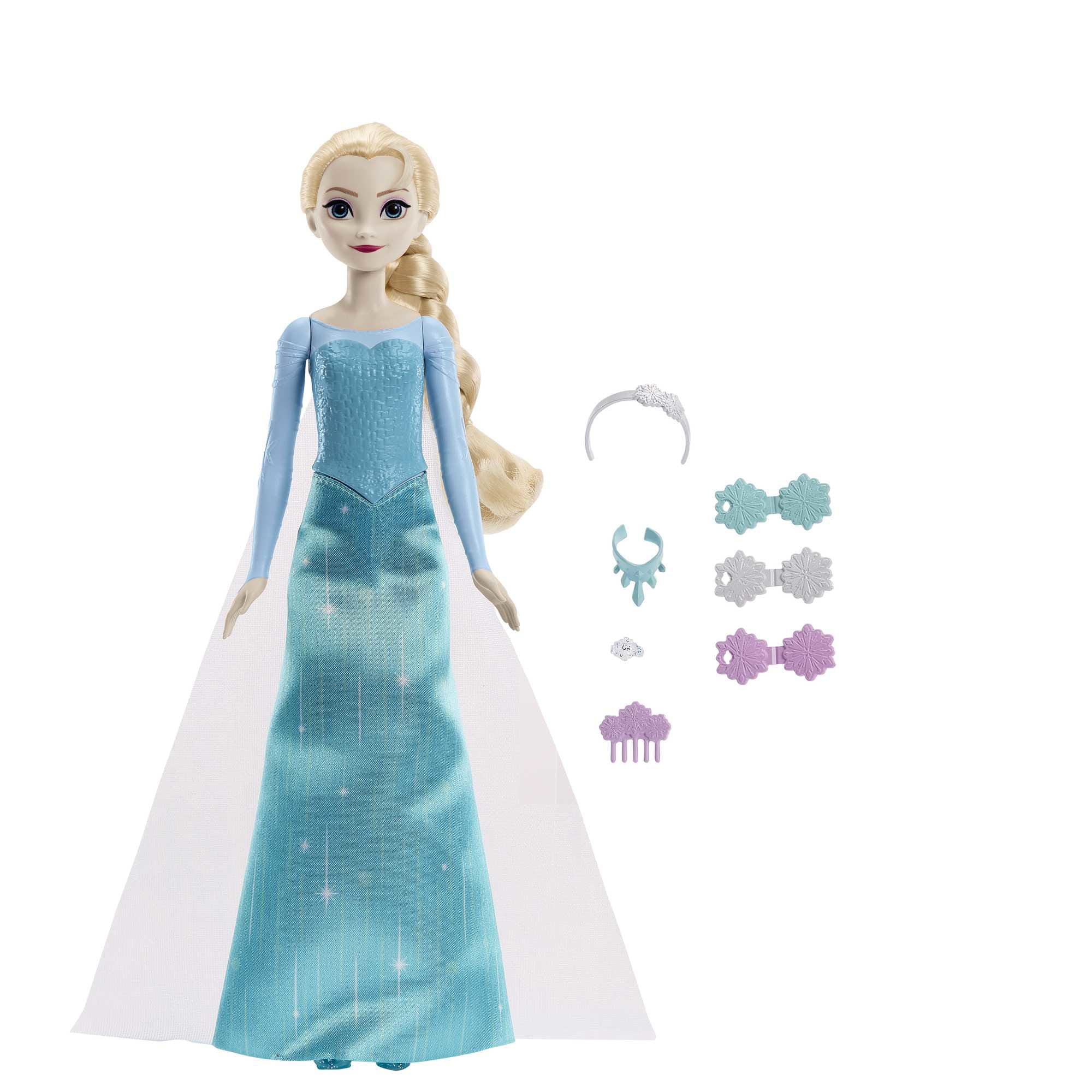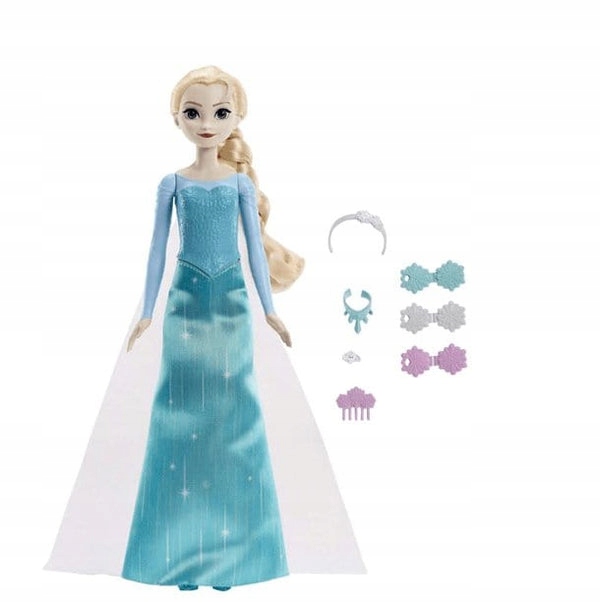 - Zawiera 9 akcesoriów do przygotowania lalki Elsy, takich jak spinki do włosów, tiara, buty i naszyjnik.