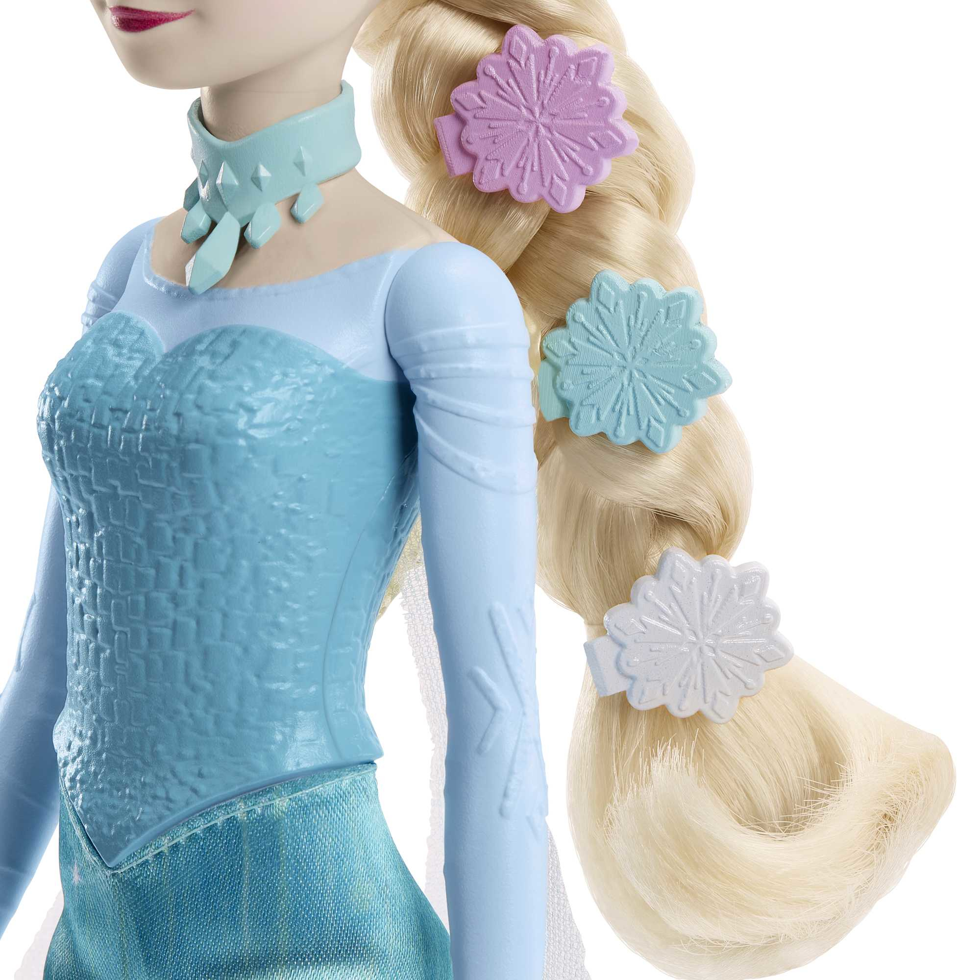 - Ruchoma lalka Elsa ma na sobie swój charakterystyczny strój, obejmujący zdejmowaną miękką spódnicę i pelerynę, a także długie, splecione włosy, które ułatwiają stylizację.
