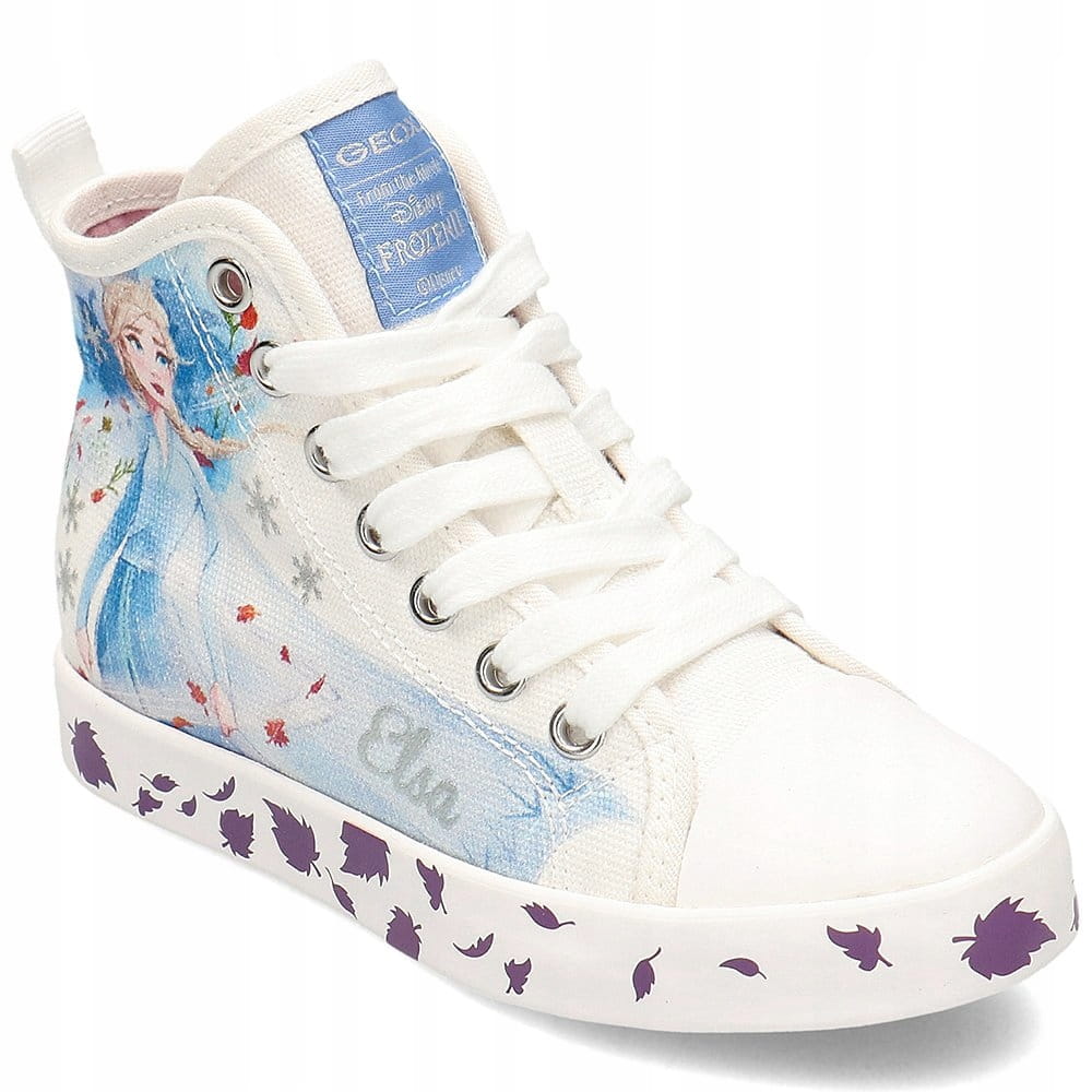 Buty dziecięce marki GEOX. Canvasowe trampki mają charakter, dzięki czemu można nimi świetnie uzupełnić dziecięcą stylizację. Biały model wzbogacono bohaterkami popularnej bajki Frozen. Materiałowa podszewka wyklucza pojawienie się odcisków. Wkładka skórzana, profilowana, z możliwością wyjęcia. Dzięki niej stopy oddychają, ma właściwości antybakteryjne i amortyzuje drgania. Mocne sznurowanie dokładnie dopasuje buty do kształtu stóp. Boczne zapięcie na suwak ułatwia ich zakładanie i zdejmowanie. Okrągły nosek oferuje luz dla palców u stóp. Podeszwa z bieżnikiem i technologią Respira, która odprowadza pot i wilgoć, pozostawiając uczucie świeżości i przyjemnego ciepła. Wkładka profilowana, wyjmowana. Długości wkładek podane przy rozmiarach są sugerowane przez producenta i w związku z tym należy traktować je wyłącznie poglądowo.
