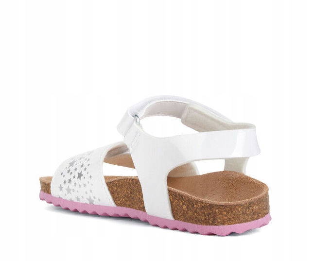 Regulowane, lekki, anatomiczne sandałki dla dziewczynek. Wykonane z białej lakierowanej skóry ekologicznej ozdobionej srebrnymi gwiazdkami. Anatomiczna skórzana wkładka jest zdrowa i zapewnia komfort i wygodę przez cały dzień