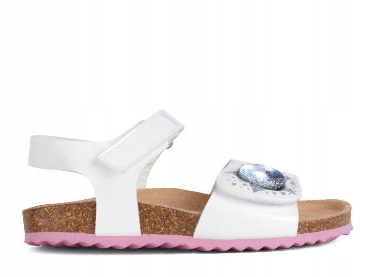 Regulowane, lekki, anatomiczne sandałki dla dziewczynek. Wykonane z białej lakierowanej skóry ekologicznej ozdobionej srebrnymi gwiazdkami. Anatomiczna skórzana wkładka jest zdrowa i zapewnia komfort i wygodę przez cały dzień