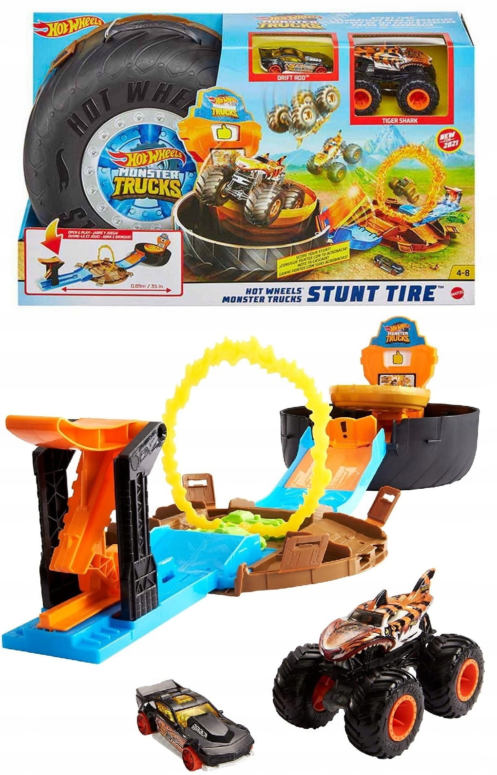 Zmontowany zestaw ma ok. 89 cm długości i wyjątkowe funkcje. Zestaw w kształcie kultowej, ogromnej opony zawiera pojazd Monster Trucks Tiger Shark i samochodzik Hot Wheels® w skali 1:64. W środku znajduje się wyrzutnia na dwa samochodziki lub na jeden pojazd Monster Trucks. Uderz wyrzutnię i poślij pojazdy po rampie i przez „pierścień ognia”