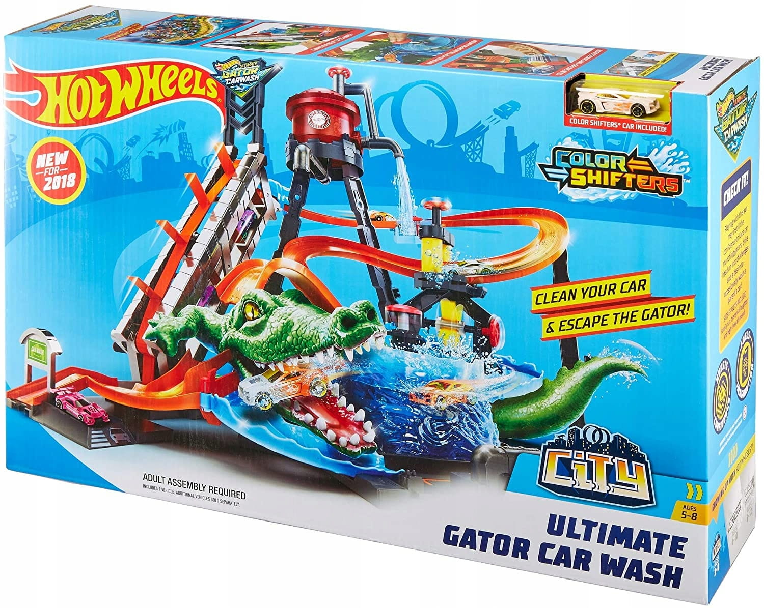 Zestaw do zabawy zawiera napędzaną korbką windę, zakręcony tor, wieżę ciśnień, zbiornik z wirem i 1 samochodzik Color Shifters™.