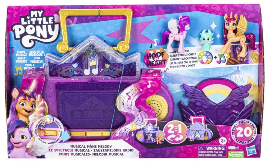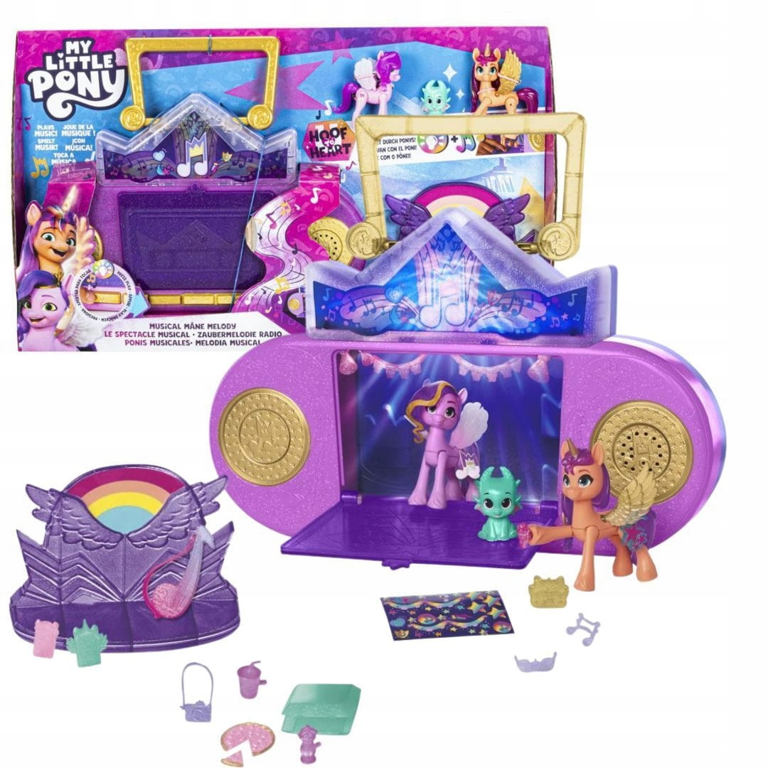 Umieść kucyka na scenie, by odtworzyć muzykę! Dostępne są fragmenty 2 piosenek z filmu. Inne postacie z innowacją Hoof to Heart są kompatybilne z tym zestawem aktywują kolejne utwory, a nawet mogą zaśpiewać w duecie z Księżniczką Petals! (Sprzedawane oddzielnie. Zależnie od dostępności.).