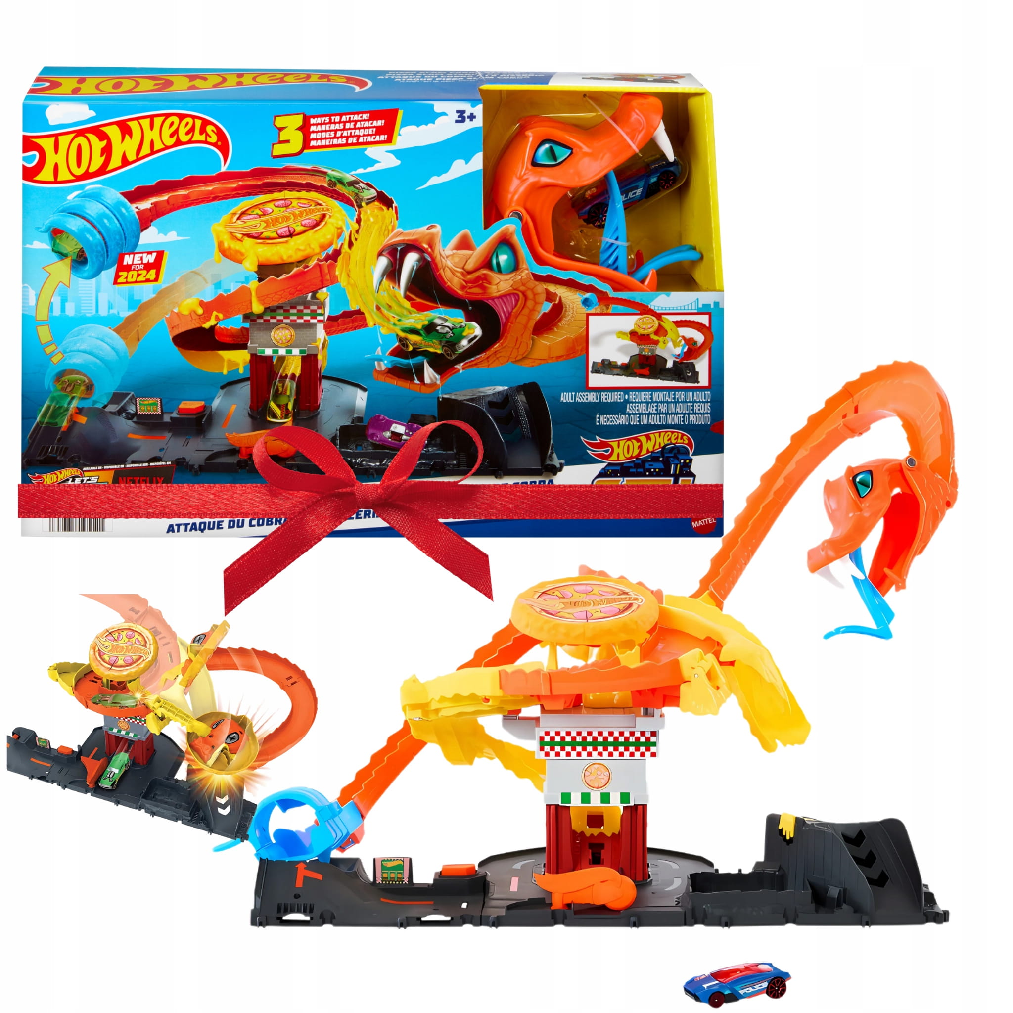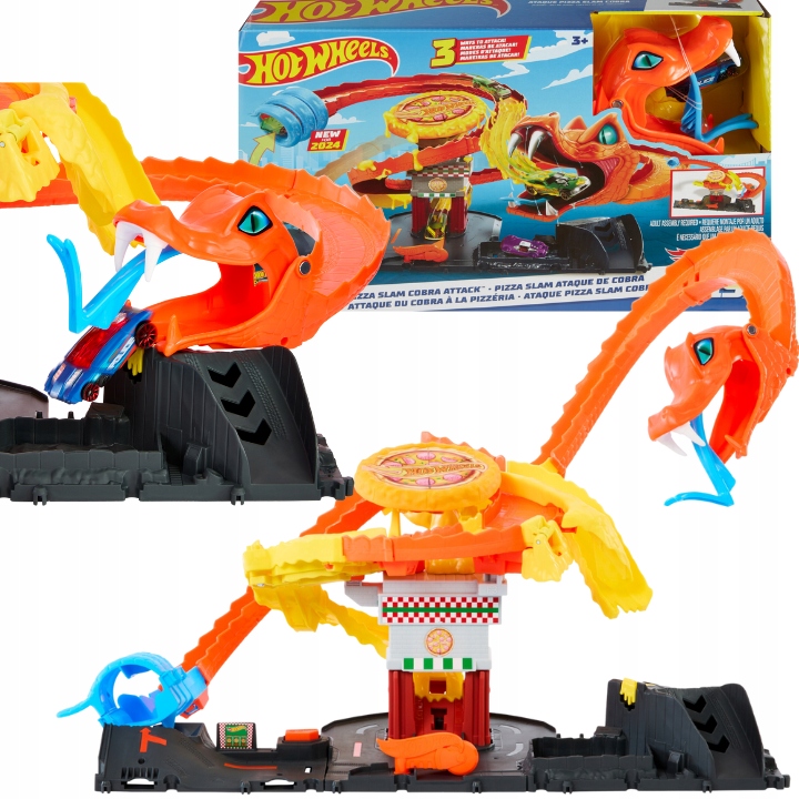 Stań do walki z wygłodniałą kobrą, która przypełzła do pizzerii, i ocal miasto Hot Wheels jak bohaterowie serialu Netfliksa \"Let's Race\"! Śmigaj po ogonie węża i przekonaj się, którą z trzech losowych dróg pojedzie autko. Wyjedzie między kłami kobry wprost do kontenera na śmieci? Czy może ta przejażdżka zakończy się w paszczy stwora? A jeśli tym razem samochodzik przyłoży potworowi pizzą między oczy i go pokona? Zachwyć się wyjątkowymi elementami toru, które napędzają rajdowe przygody i łączą się z innymi zestawami Hot Wheels City, aby zabawa nie miała granic. Sprzedawane oddzielnie. Zestaw zawiera jeden pojazd Hot Wheels. Kolory i elementy dekoracyjne mogą się różnić.