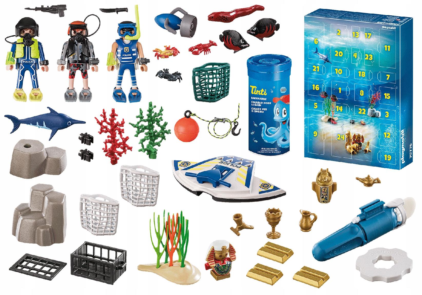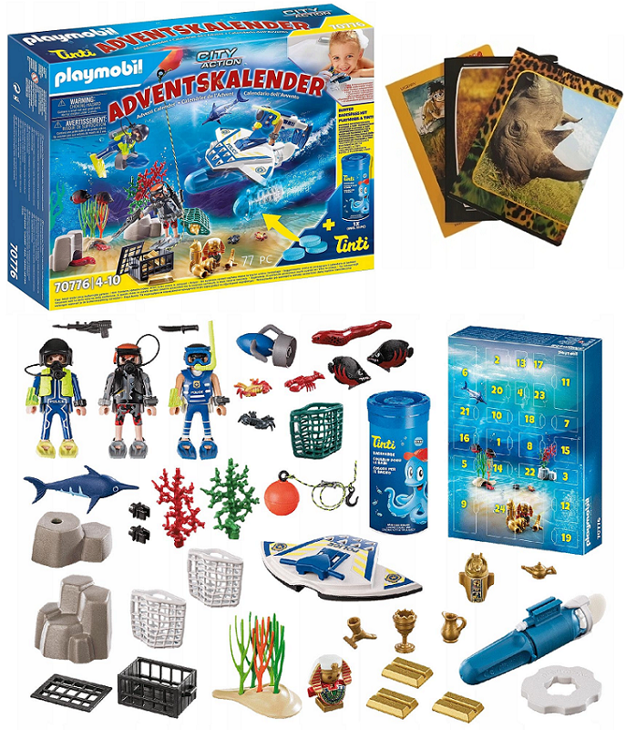 To może potrwać dość długo – ale nie z kolorowymi kalendarzami adwentowymi PLAYMOBIL. W kalendarzu adwentowym „Bathtime Fun Police Diving Mission” przedstawia ekscytujące operacje policyjne na dnie morskim. Złodziej ukrył swoje cenne łupy pod wodą między koralowcami. Ale zaradni nurkowie policyjni już depczą mu po piętach ze swoimi podwodnymi skuterami. W mgnieniu oka nie tylko złapali złodzieja, ale także przejęli łup. Myślę, że ten plan nie zadziałał! Zestaw zawiera kalendarz adwentowy z 24 niespodziankami, trzy figurki PLAYMOBIL, dużą i małą hulajnogę do nurkowania, małego miecznika, mureny, dwie ryby-motylki, homara, dwa kraby, kamienie, koralowce i inne wspaniałe akcesoria do ekscytującej zabawy pod wodą misje. Jako dodatek specjalny kalendarz zawiera farbę do kąpieli Tinti. Po prostu włóż o połowę tabletkę farby do siatki skutera do nurkowania, a skuter będzie rysował w wodzie chłodne kolory podczas jazdy. Świetna zabawa w kąpieli z Tinti i PLAYMOBIL!