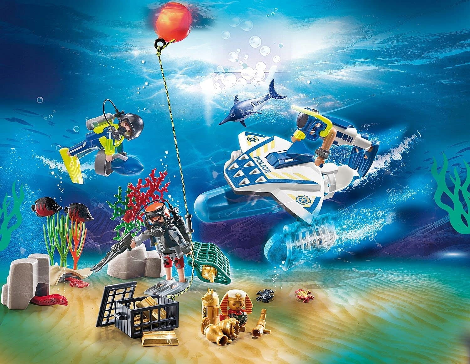 - Akcesoria: 1 duża hulajnoga podwodna, 1 silnik podwodny, 1 pierścień sterujący do silnika podwodnego, 2 uchwyty na siatki, 3 siatki, 1 mała hulajnoga podwodna, 1 boja pływająca z liną i hakiem, 2 x kamizelki nurkowe z regulatorem i butlami nurkowymi, 3 pary płetw do nurkowania, 1 kask do nurkowania, 2 okulary do nurkowania, 1 fajka do nurkowania, 1 nóż do nurkowania, 1 harpun, 2 ręczne urządzenia nawigacyjne, 1 pudełko z kratką z pokrywką, 1 kielich, 1 baldachim, 1 popiersie, 3 sztabki złota, 1 dzbanek, 1 magiczna lampa, 1 róg, 1 mankiet, 2 duże mankiety, 1 zegarek na rękę, 1 roślina podwodna, 1 kamień z kryjówką, 1 kamień z koralem, 1 x farba do kąpieli Tinti niebieska (zawartość: 10 kolorowych tabletek)