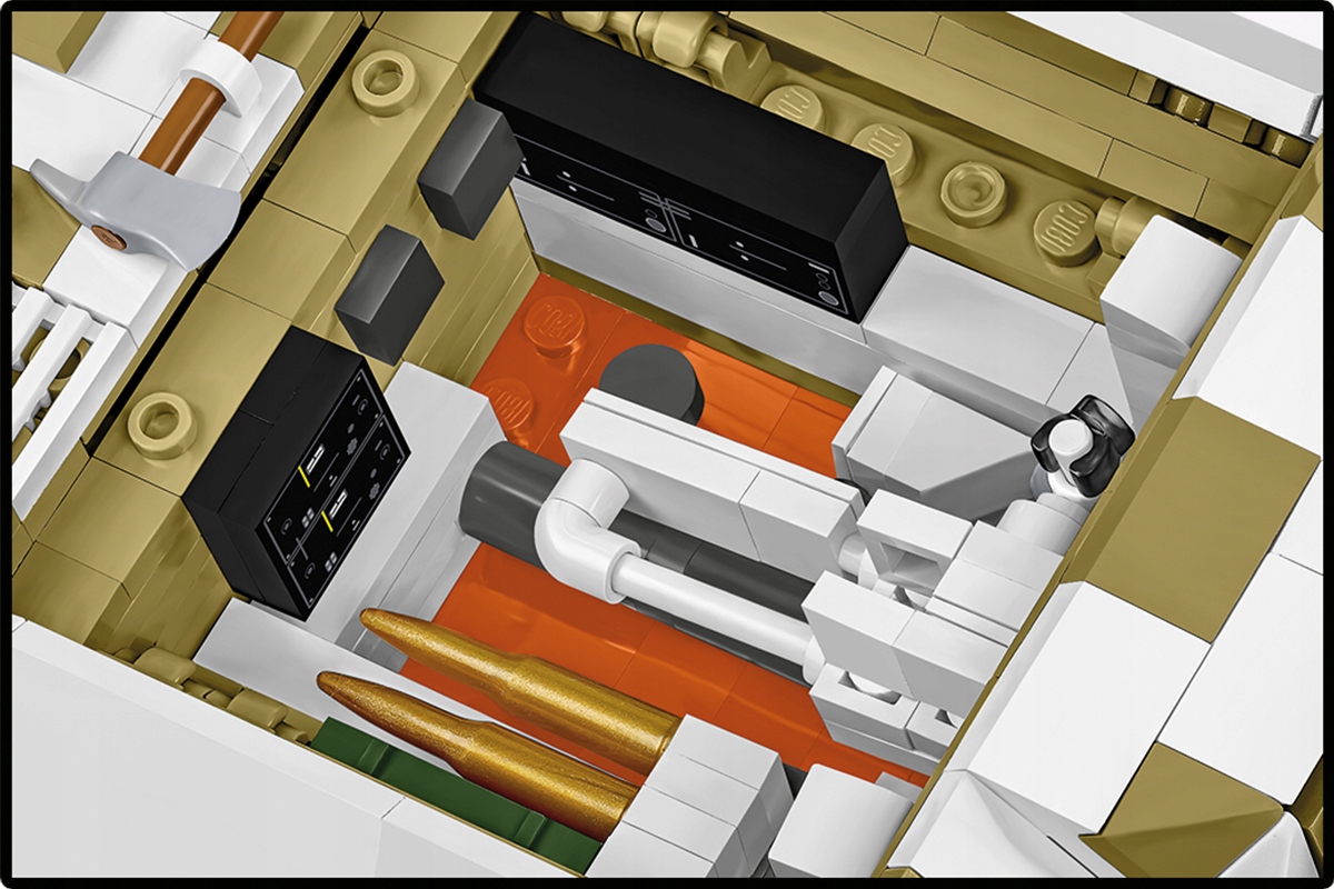 - Odwzorowane wnętrze – nie tylko pancerz i oznaczenia, ale także wnętrze niszczyciela zostało zrekonstruowane z historyczną starannością. Zdejmowany fragment pancerza pozwala zajrzeć do środka i podziwiać część silnikową oraz miejsce dla załogi.