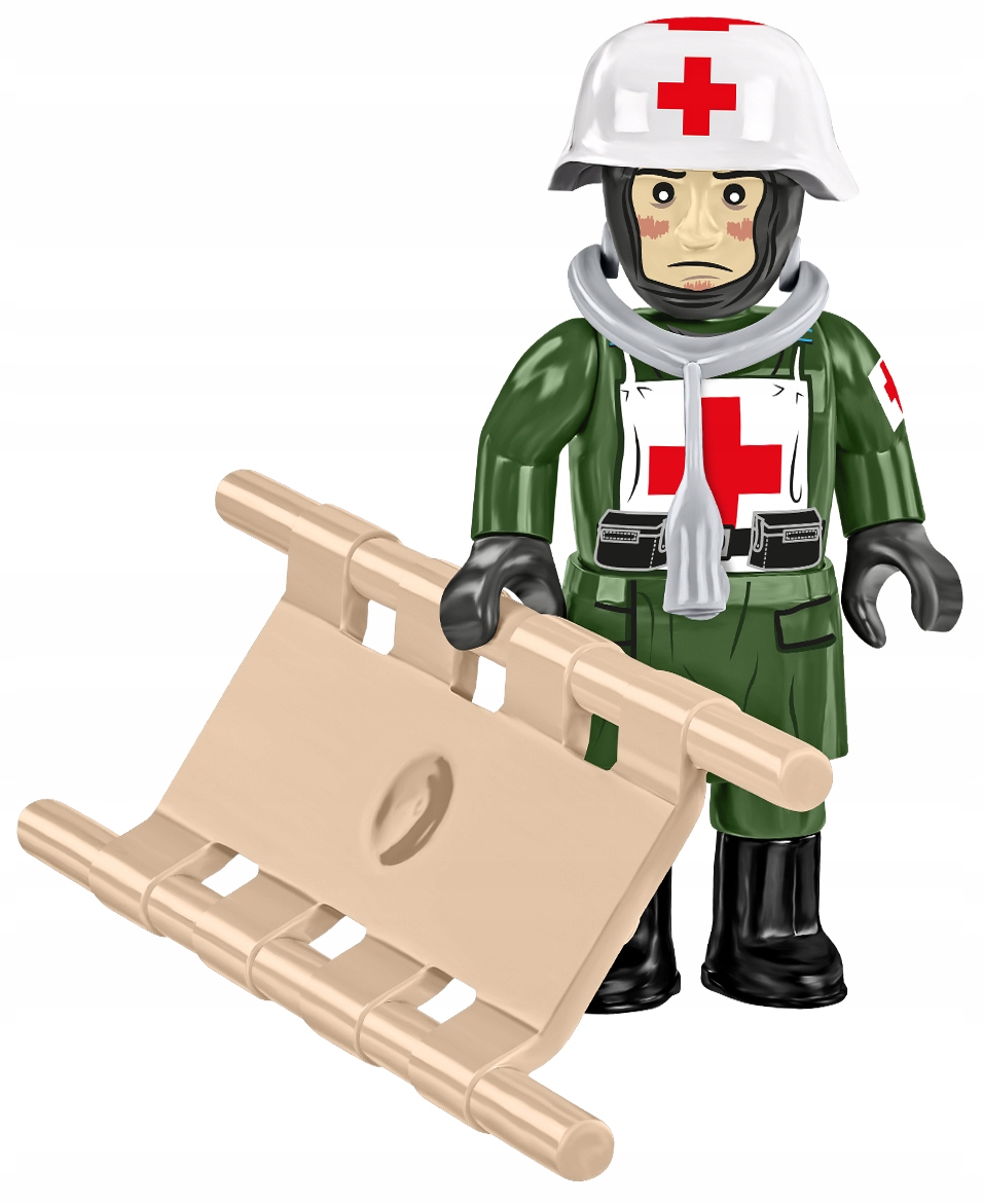 - Wojskowy sanitariusz – w długim zielonym płaszczu z oznaczeniami czerwonego krzyża, z wojskowymi noszami i stetoskopem, w stalowym hełmie pokrytym odwzorowanym materiałem z czerwonym krzyżem.