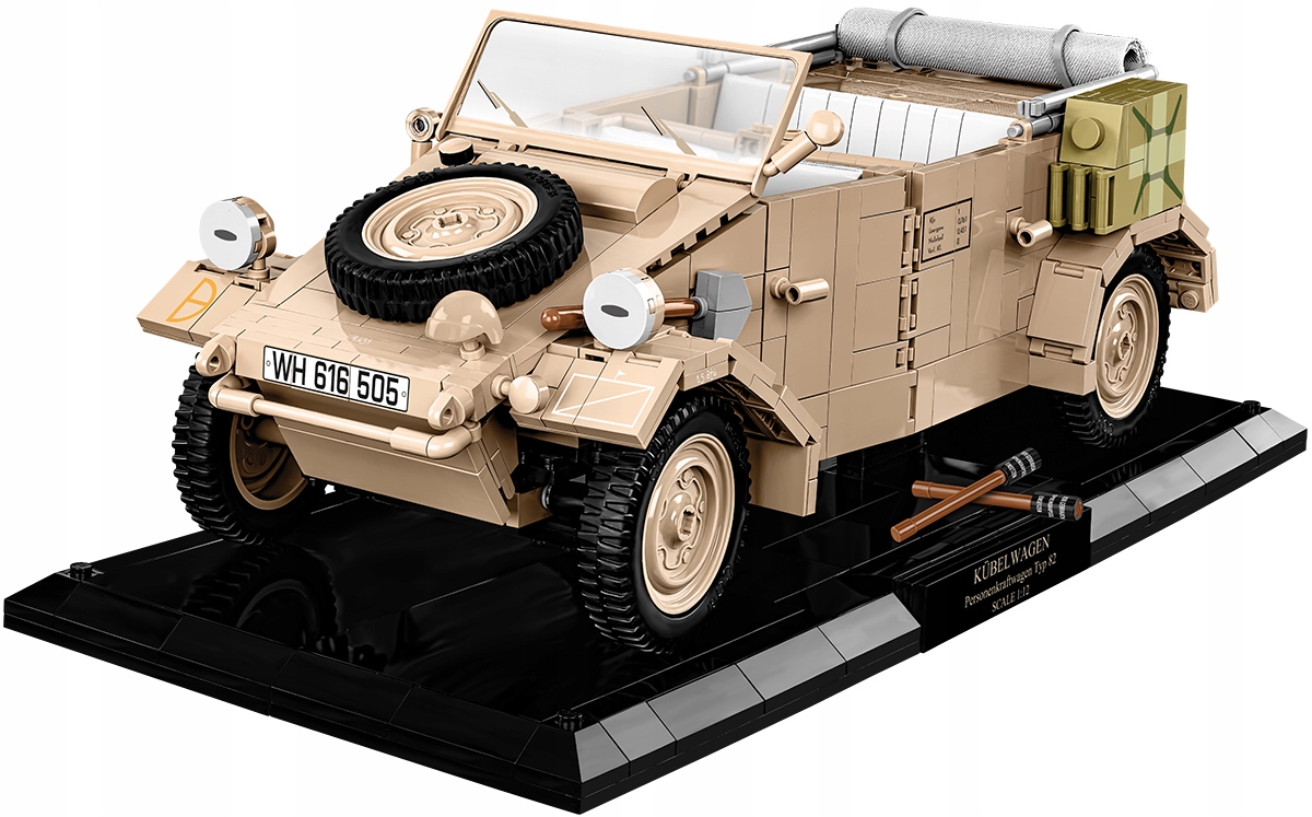 Po złożeniu Kübelwagen ma 30,5 cm długości. Uwagę zwraca starannie odwzorowane wnętrze, doskonały zewnętrzny design, zupełnie nowe elementy zaprojektowane specjalnie na potrzeby tak dużego zestawu. Wnętrze auta jest szczegółowo odwzorowane w każdej jego części, włączając w to kierownicę, fotele, gałki, przełączniki i komorę silnika zawierającą dodatkowe narzędzia! Zewnętrzna strona również podnosi poprzeczkę pod względem dokładności proporcji i detali, które może zapewnić jedynie zestaw tej wielkości. Wystarczy tylko wspomnieć o dedykowanej szybie, otwieranych drzwiach, dostępie do klapy bagażnika i komory silnika, elementach wyposażenia oraz skrętnych kołach, którymi można poruszać za pomocą kierownicy. Nasze modele w skali 1:28 uchodzą za bardzo szczegółowe.