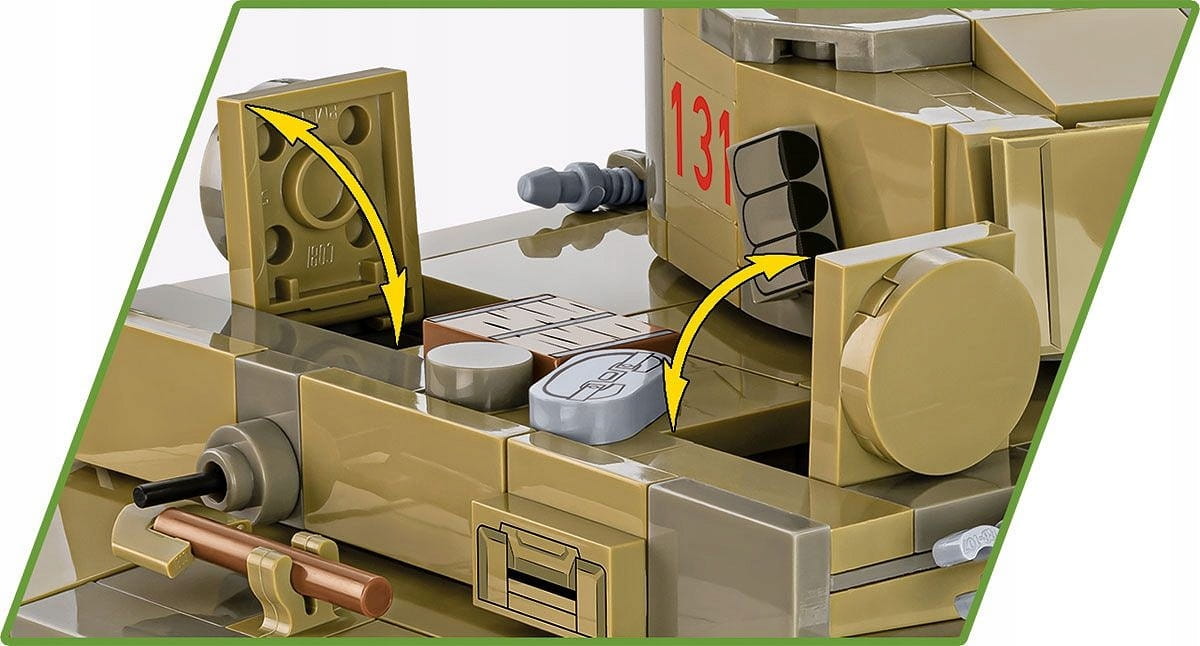 Model posiada ruchome elementy takie jak: wieża i lufa działa oraz obracające się koła i gąsienice. Dopracowany zestaw składa się z 898 elementów i wiernie odzwierciedla oryginalne kształty swego historycznego pierwowzoru. Nasz potężny klockowy czołg został pokryty wysokiej jakości nadrukami, które się nie ścierają. Na szczególną uwagę zasługuje bliska oryginałowi kolorystyka, która sprawia, że model wygląda olśniewająco! W zestawie znajduje się mini model silnika Maybach, który można wyeksponować obok modelu lub umieścić w czołgu pod klapą serwisową. Model posiada ruchome koła i gąsienice składające się z wielu ogniw. W trakcie zabawy można jeździć czołgiem i obserwować pracującą trakcję gąsienicową! Włazy są otwierane i pod nimi znajduje się miejsce dla standardowych figurek COBI. Fgurka przedstawia dowódcę czołgu w tropikalnym umundurowaniu. Całość zestawu uzupełnia biała tabliczka z nadrukowaną nazwą czołgu oraz logotypem The Tank Museum!