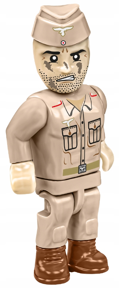 - Figurka artylerzysty Luftwaffe – W zestawie znajdziesz figurkę żołnierza ubranego w klasyczny piaskowy mundur. Figurka artylerzysty została wyposażona trzema pociskami artyleryjskimi wiernie odwzorowanymi w skali klockowej. To wojak charakterystycznej furażerce, który wygląda na frontowego weterana i doświadczonego żołnierza.