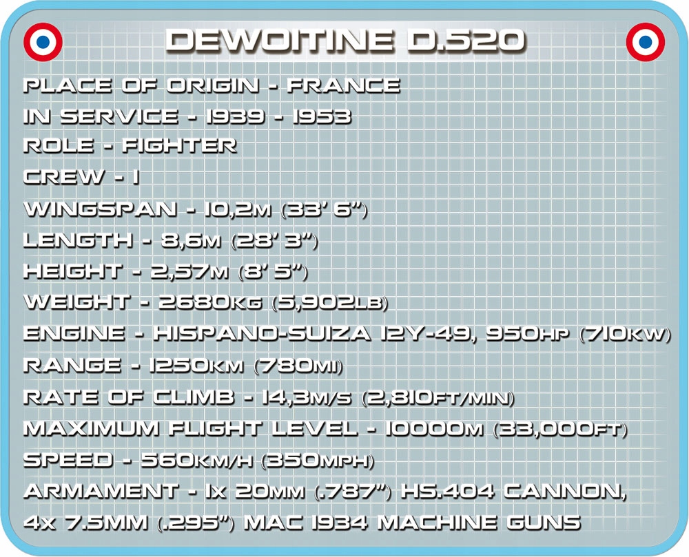 Po raz pierwszy w ofercie COBI pojawił się najnowocześniejszy francuski myśliwiec z okresu II wojny światowej. Dewoitine D.520 został zaprojektowany i zbudowany w 1938 roku w wytwórni lotniczej Société nationale des constructions aéronautiques du Midi. Samolot Dewoitine D.520 był jednomiejscowym samolotem myśliwskim, dolnopłatem o konstrukcji całkowicie metalowej. Produkowany seryjnie od marca 1939 roku. Produkcji samolotu nie przerwała kapitulacja Francji w 1940 roku. Kolejne egzemplarze powstawały na potrzeby rządu Vichy, Luftwaffe oraz armii włoskiej, bułgarskiej i rumuńskiej. Polscy piloci broniący Francji zostali wyposażeni w 26 samolotów tego typu podczas niemieckiej inwazji w 1940 roku. Łącznie wyprodukowano ok. 755 sztuk myśliwca. Konstrukcja okazała się na tyle dobra, że samolot po wojnie pozostawał w służbie aż do 1953 roku.