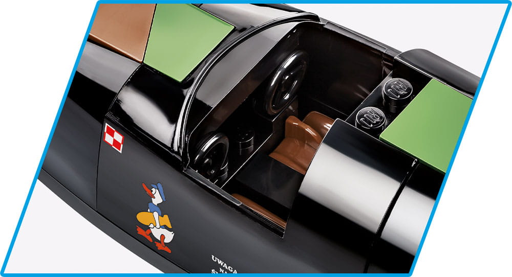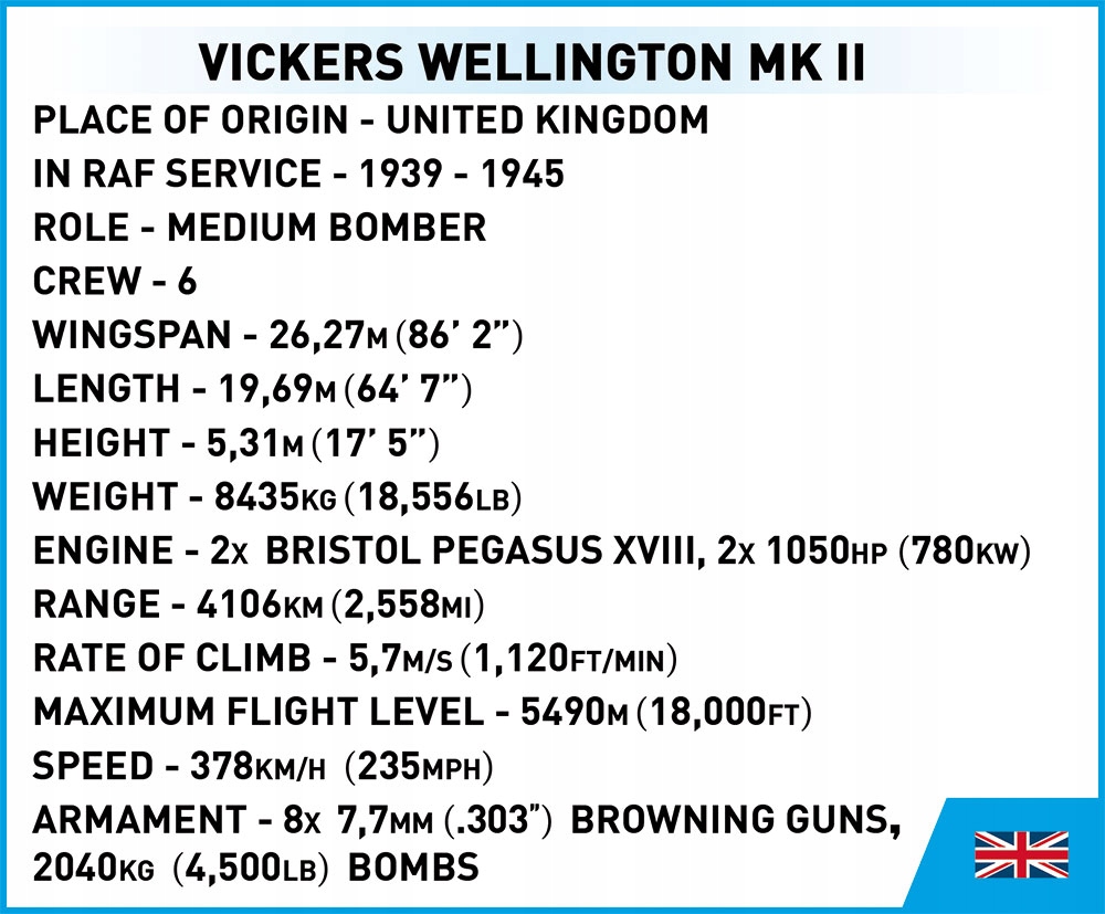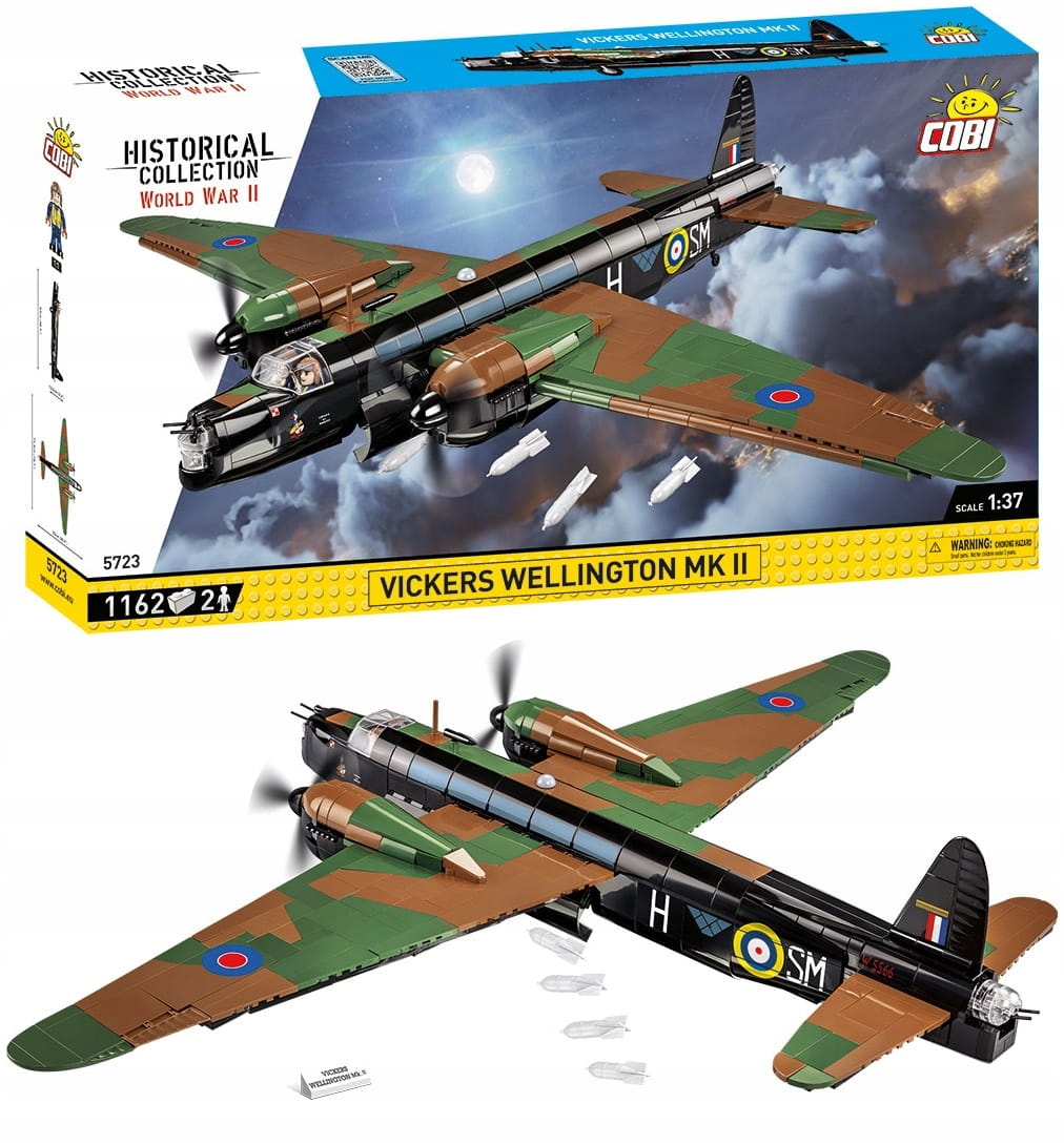 Brytyjski Bombowiec Vickers Wellington został precyzyjnie odwzorowany z klocków konstrukcyjnych COBI w skali 1:37. Samolot ma 53 cm długości i aż 71,5 cm rozpiętości skrzydeł. Przygotowanie tak ogromnego modelu wymagało użycia aż 1162 elementów. W zestawie znajdziemy precyzyjne nadruki, które nie ścierają się w trakcie intensywnego użytkowania. Entuzjaści historii docenią nadrukowane historyczne oznaczenia 305 Dywizjonu Bombowego Ziemi Wielkopolskiej i Lidzkiej im. Marszałka Józefa Piłsudskiego. Nie zabrakło nawet symbolu Kaczora niosącego bombę! Samolot posiada obracające się śmigła, składane koła oraz otwieraną kabinę, w której można umieścić dołączonych do zestawu dwóch pilotów. Luk na spodzie samolotu otwiera się i możemy tam umieścić klockowe bomby.
