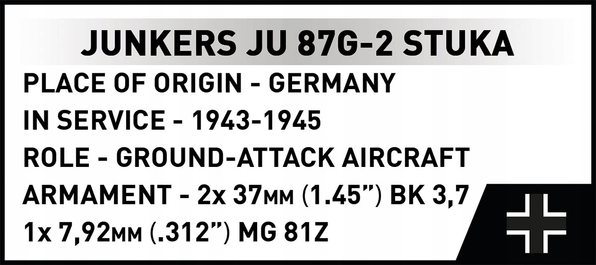 - Klockowy model Junkers Ju 87 G-2 STUKA – zestaw opracowany z dbałością o proporcje i detale charakterystyczne dla tej wersji samolotu. Skrzydła w konfiguracji „W” nadają mu niepowtarzalny wygląd i natychmiast przywodzą na myśl legendarną STUKĘ. W modelu zastosowano zupełnie nowy klocek. Przeszklenie kabiny pilotów powstało specjalnie z myślą o tym modelu i wiernie oddaje wygląd oryginału Potężne działka podskrzydłowe dopełniają całości!