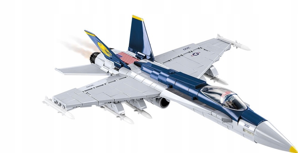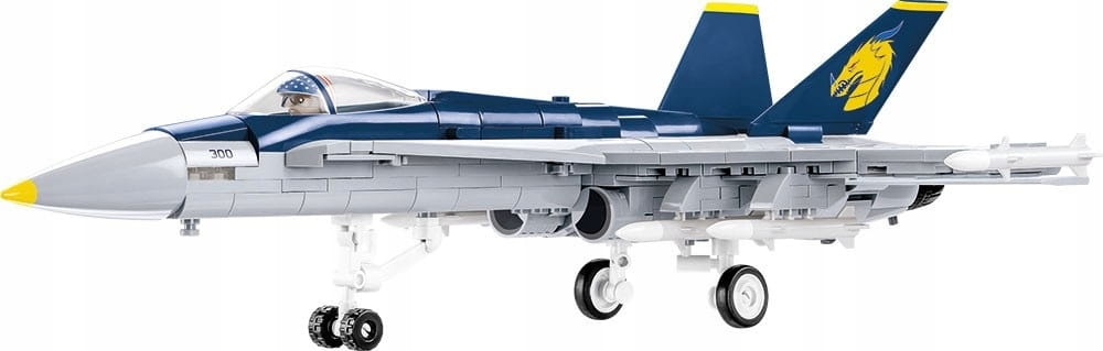 F/A-18C Hornet™ to wyjątkowy model myśliwca wielozadaniowego w barwach słynnej eskadry myśliwskiej Marynarki Wojennej USA. Samolot został przygotowany w modelarskiej skali 1:48 przy wykorzystaniu 538 klocków konstrukcyjnych COBI. W zestawie znajdziesz wysokiej jakości nadruki odwzorowujące malowanie oryginalnej maszyny. Model został wyposażony w składane podwozie i obracające się koła. W Na klockach znajdują się wysokiej jakości nadruki. Nie ma tutaj naklejek! Pod skrzydłami znajduje się pokaźny arsenał uzbrojenia. W kabinie możemy umieścić specjalny klocek-pilota. W zestawie znajduje się również klockowa podstawka ekspozycyjna oraz tabliczka zawierająca nazwę samolotu.