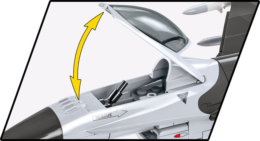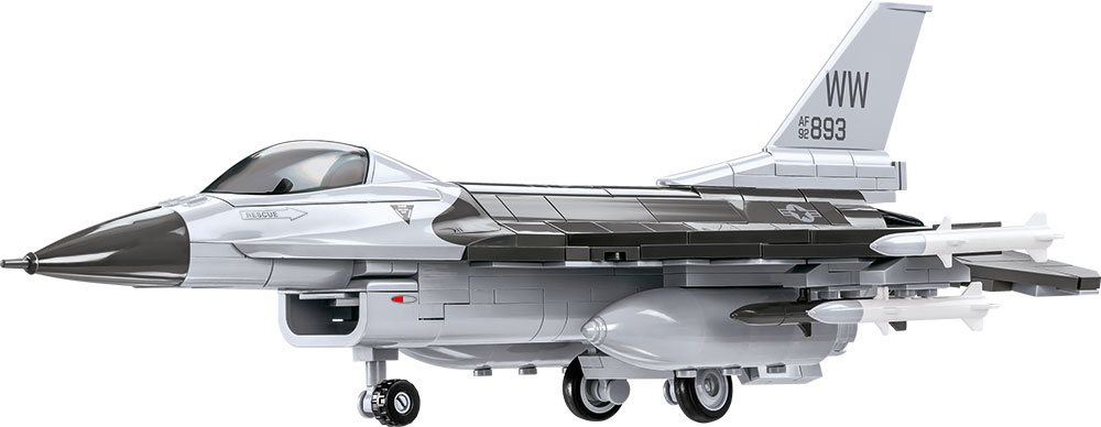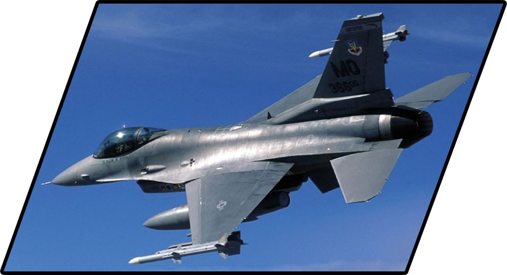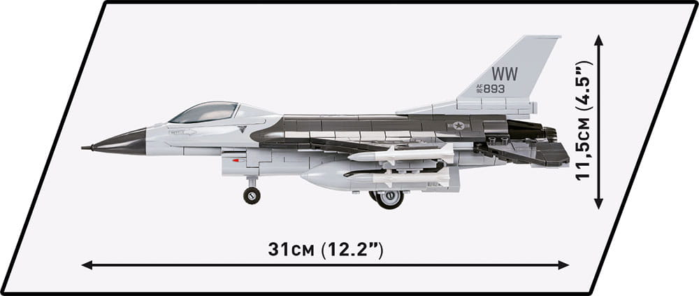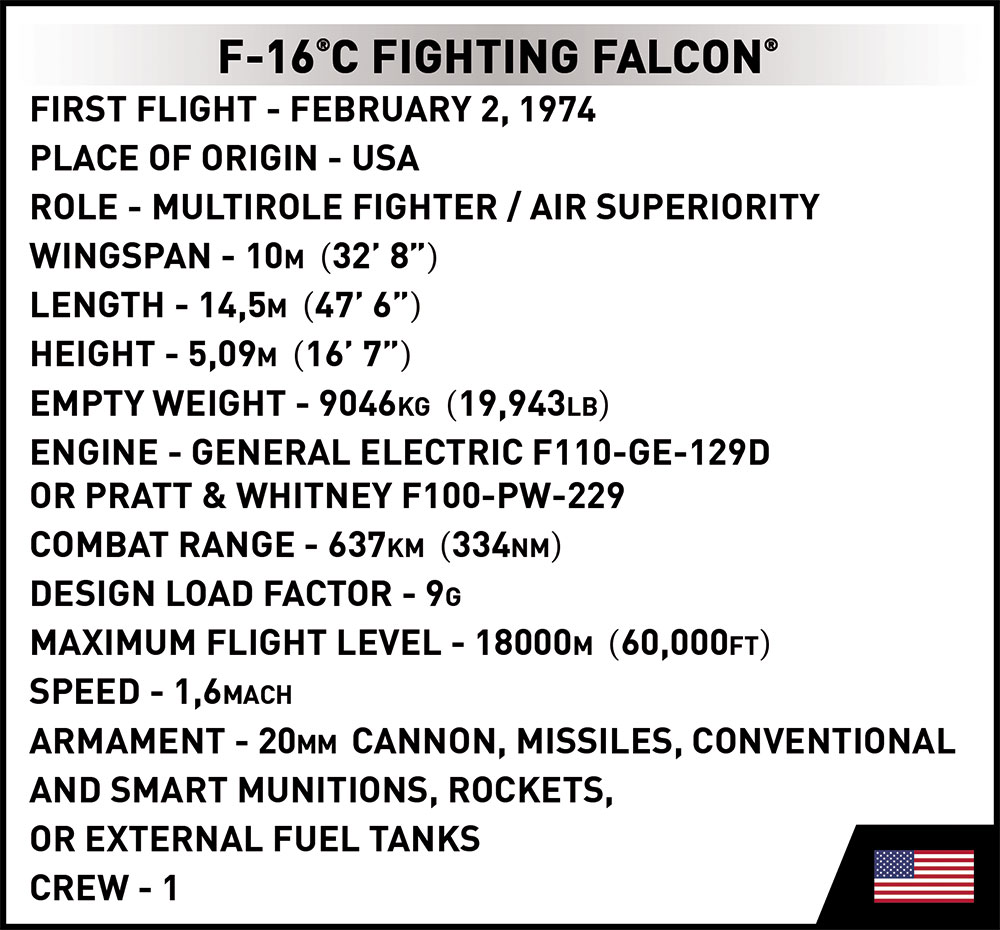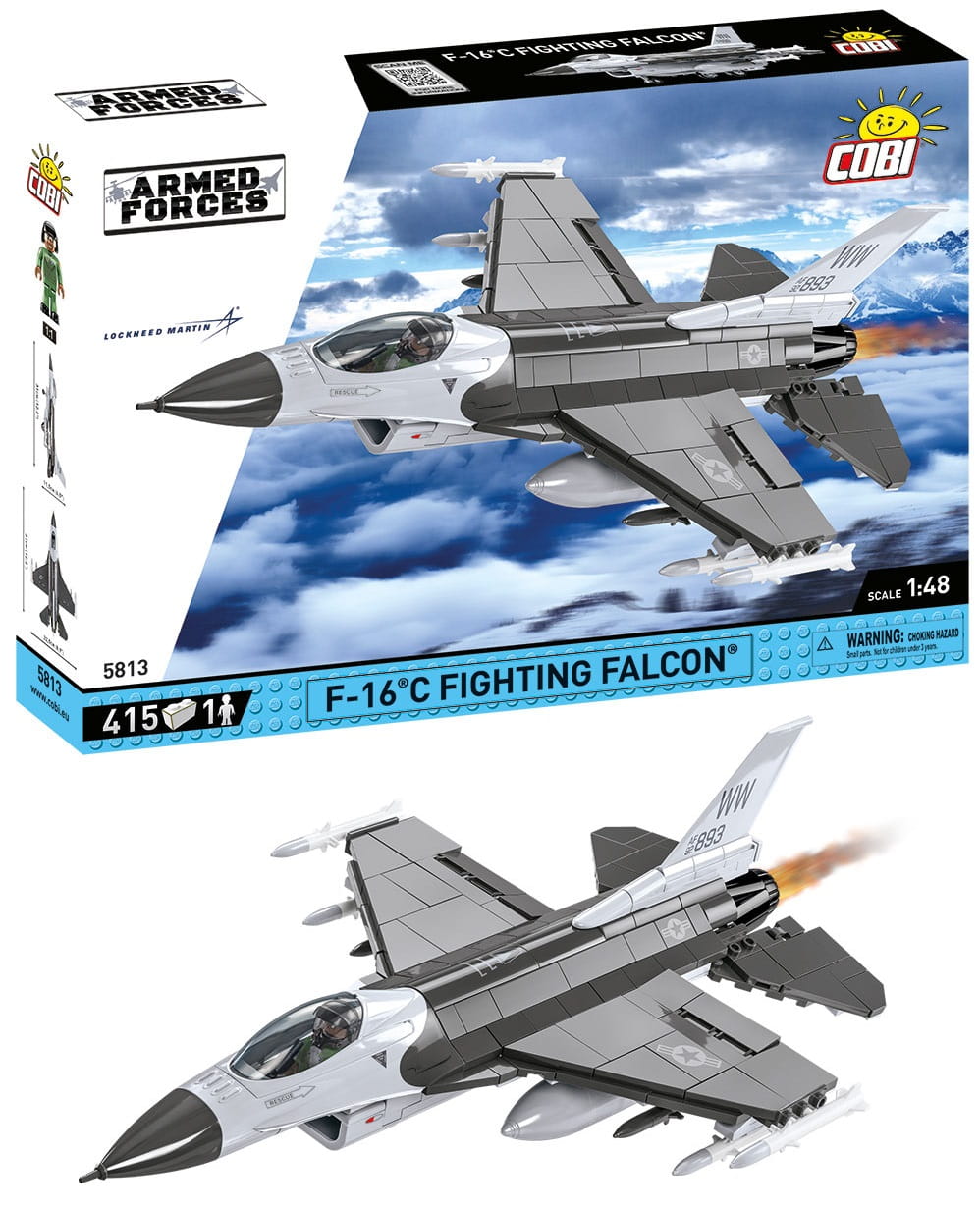Z 415 najwyższej jakości klocków konstrukcyjnych COBI wybudujesz wydany na licencji megakoncernu zbrojeniowego Lockheed Martin najpopularniejszy na świecie samolot myśliwsko-szturmowy F-16® FIGHTING FALCON®. Zestaw został starannie zaprojektowany w modelarskiej skali 1:35. Klocki zostały pokryte wysokiej jakości nadrukami. Kabina pilota wykonana w nowej technologii dwukolorowego wtrysku to nowa jakość w COBI! Do zestawu dołączona jest figurka pilota wyposażonego w kask i maskę tlenową z wężykiem. Całość zestawu uzupełnia klockowa podstawka ekspozycyjna z tabliczką zawierającą nazwę zestawu!