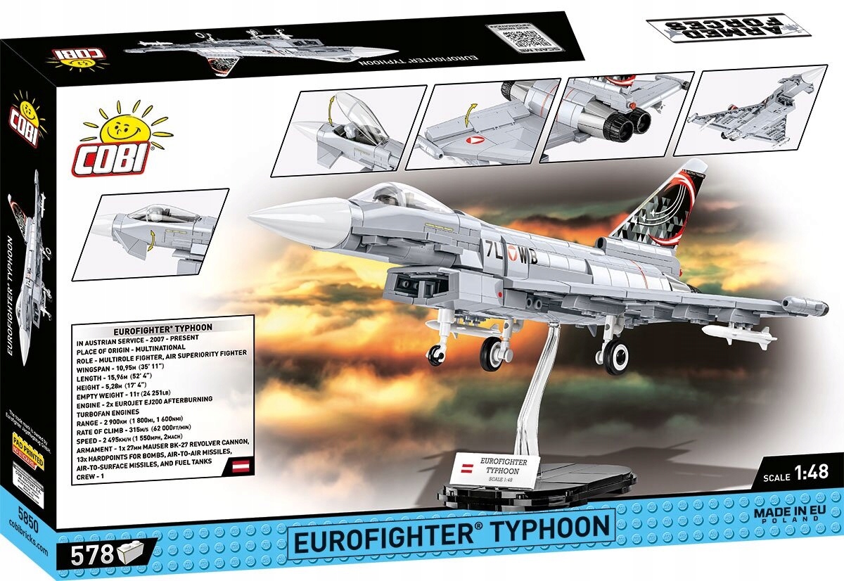 Z 578 najwyższej jakości klocków konstrukcyjnych COBI wybudujesz wielozadaniowy myśliwiec EUROFIGHTER® w barwach Austriackich Sił Powietrznych.