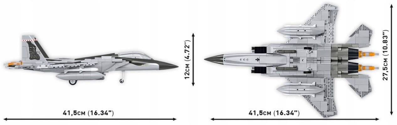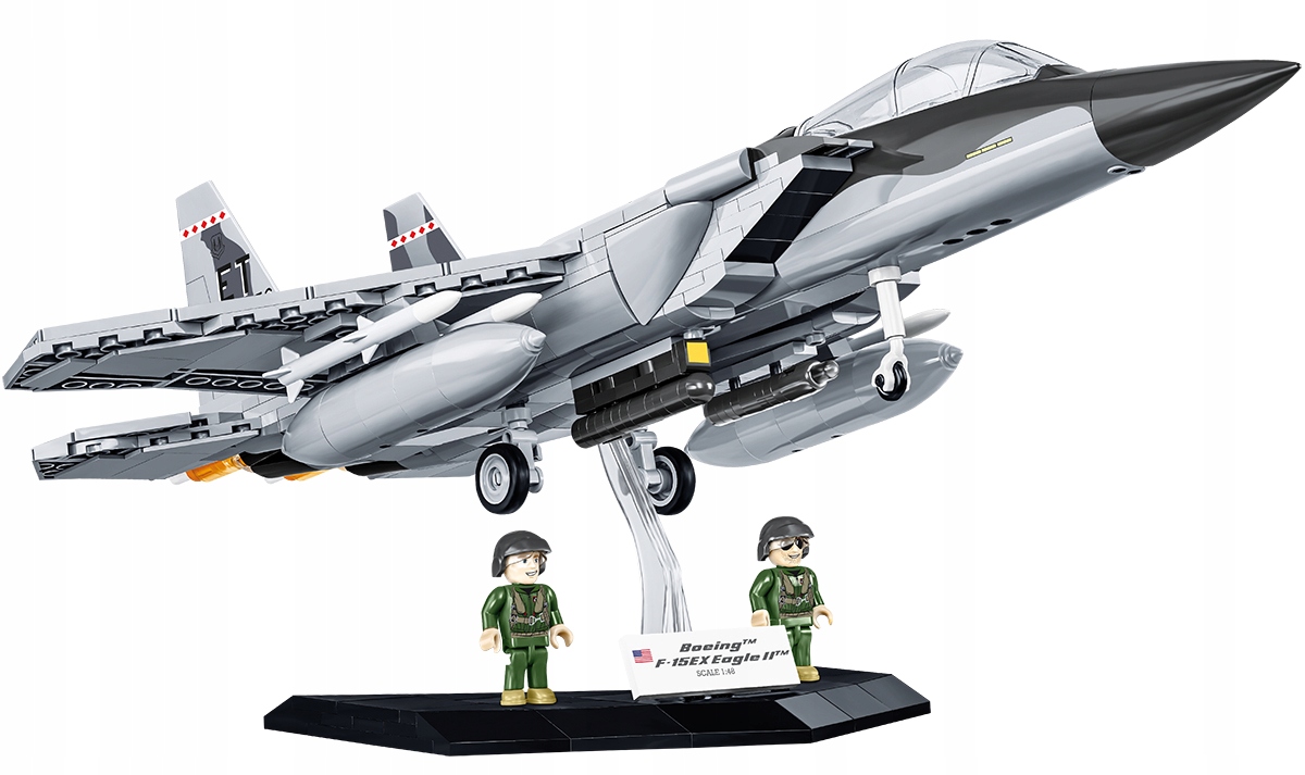 Dlaczego warto wybrać zestaw Boeing F-15EX Eagle II?• Skala 1:48 – Dokładne odwzorowanie detali w skali 1:48 pozwala na wierne oddanie wszystkich charakterystycznych cech myśliwca, od aerodynamicznych kształtów po detale wnętrza kokpitu.• Ruchome elementy – Model posiada ruchome lotki, otwierany kokpit i obrotowe koła, które dodają realizmu i pozwalają na zabawę w odtwarzanie powietrznych misji bojowych.• Precyzyjne oznaczenia – Model wiernie odwzorowuje oznaczenia F-15EX, zapewniając doskonały wygląd i autentyczność, co czyni go wyjątkowym elementem kolekcji.• Dwa piloci w pełnym umundurowaniu i oryginalnych oznaczeniach – Zestaw zawiera także dwie szczegółowo odwzorowane figurki pilotów w pełnym, oryginalnym umundurowaniu. Figurki można umieścić w kokpicie samolotu lub wyeksponować na podstawce.• Gratka dla kolekcjonerów – Zestaw uzupełnia klockowa podstawka ekspozycyjna z tabliczką zawierającą nazwę zestawu oraz flagę USA.• Łatwy montaż – Dzięki szczegółowej instrukcji, każdy etap składania modelu jest łatwy i przyjemny. To wspaniała okazja do nauki o budowie myśliwców, która dostarczy zarówno młodszym, jak i starszym modelarzom wielu radości.• Zabawka i ozdoba w jednym – Po złożeniu model staje się doskonałą ozdobą pokoju, idealnie prezentującą się na półce pasjonatów lotnictwa.• Edukacyjna zabawa – Budowanie modelu F-15EX to doskonała okazja do poznania historii współczesnego lotnictwa wojskowego, rozwijania umiejętności konstrukcyjnych i odkrywania fascynujących technologii związanych z nowoczesnym myśliwcem.• Wysoka jakość wykonania – Zestaw składa się z precyzyjnie wykonanych elementów, zapewniając wyjątkową jakość i dokładność w odwzorowaniu detali.