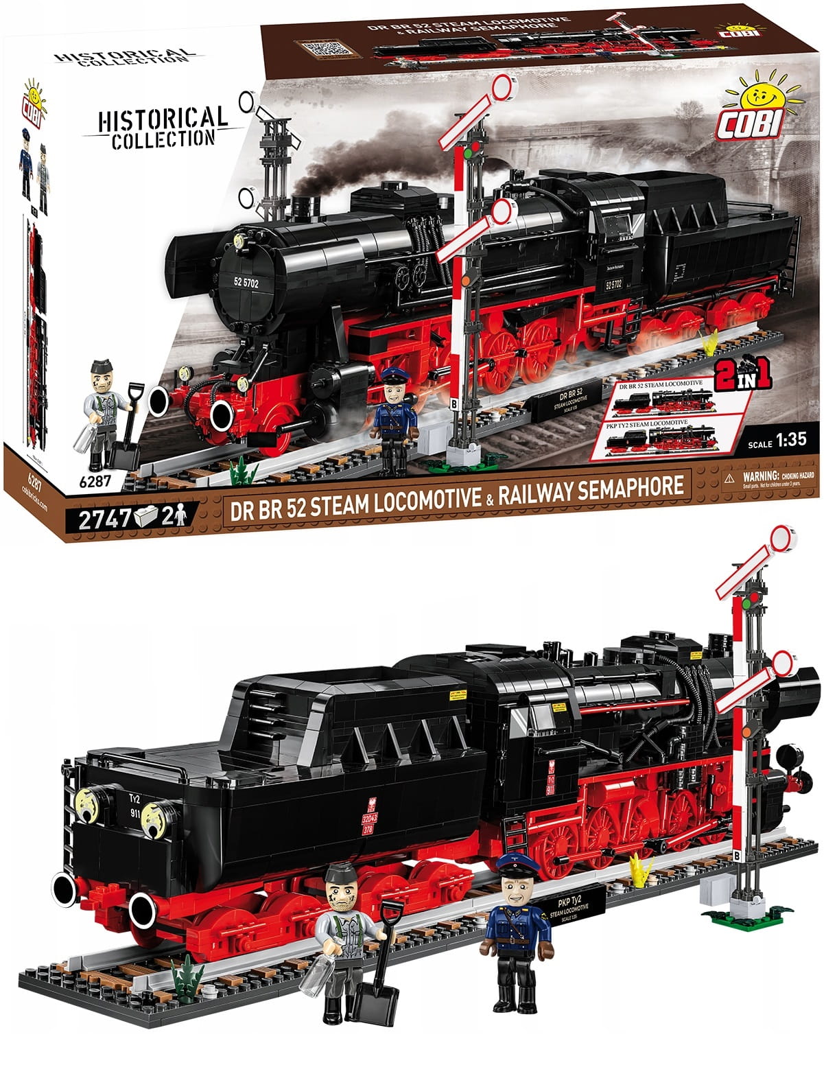 Konstrukcja z klocków wiernie odwzorowuje bryłę, proporcje i detale legendarnego parowozu, który jest chyba najpopularniejszym i najbardziej rozpoznawalnym dla wszystkich pasjonatów kolejnictwa na świecie. Ekskluzywne wydanie 2 in 1 zawiera aż dwa różne komplety dodatkowych klocków, które pozwalają na zbudowanie modelu niemieckiej lokomotywy DR BR 52 z niemieckimi oznaczeniami z okresu II wojny światowej lub lokomotywy z polskimi oznaczeniami Polskich Kolei Państwowych z okresu powojennej Polski Rzeczpospolitej Ludowej.