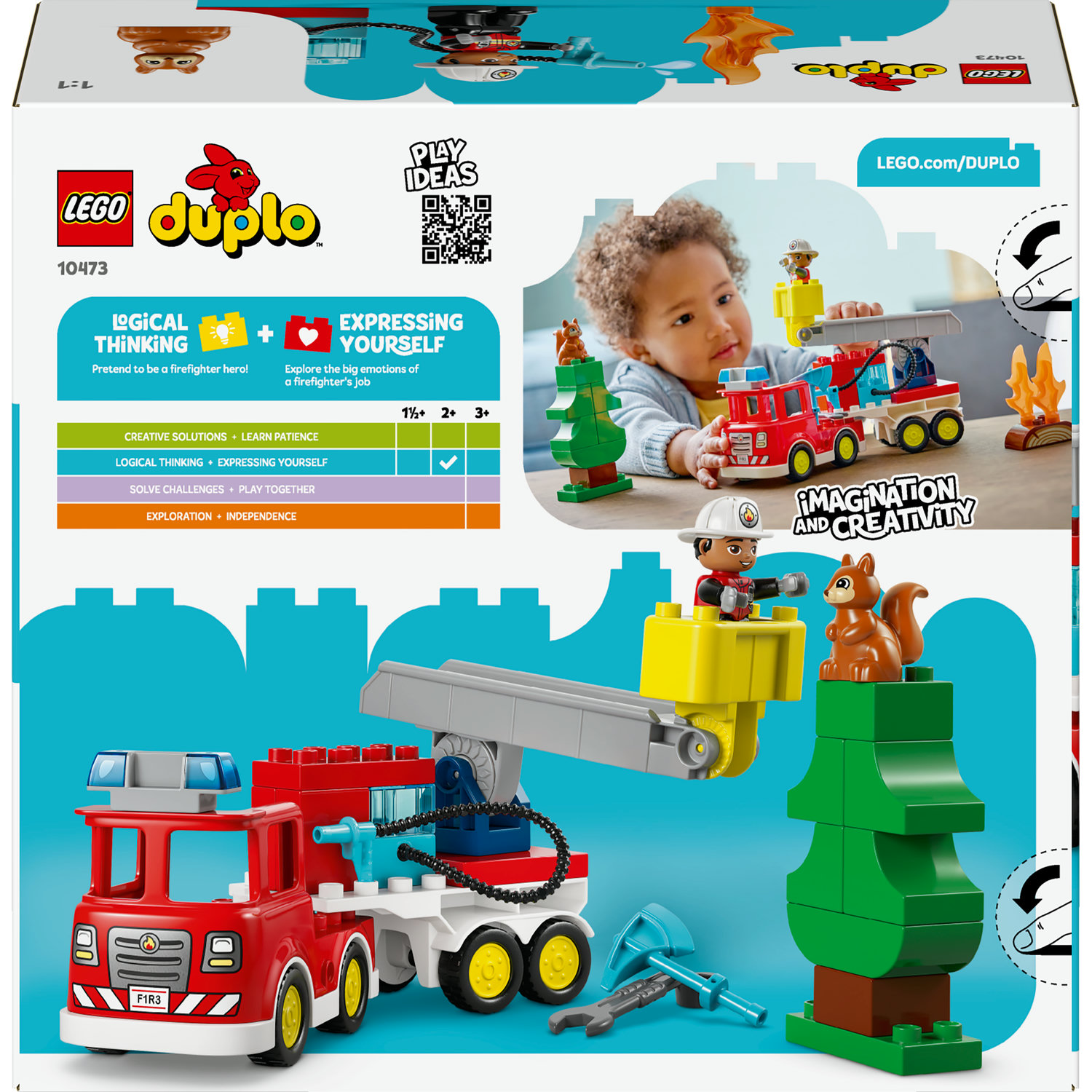 - Mnóstwo ciekawych funkcji — zestaw zawiera model wozustrażackiego z odłączaną przyczepą, figurkę strażaka, wiewiórkę LEGO® DUPLO®, siekierę i klucz, które zachęcają do kreatywnej zabawy w ratowanie świata