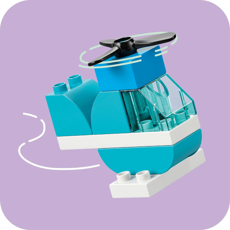 - Pojazdy codziennego użytku — główne modele zestawu LEGO® DUPLO® dla dzieci obejmują mały samochód, helikopter z obracającym się wirnikiem, wywrotkę z odchylaną naczepą oraz wóz strażacki z drabiną i innymi elementami