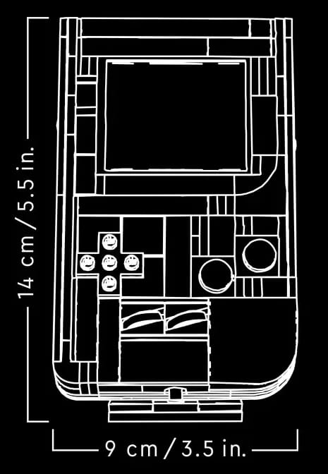 Zestaw kolekcjonerski zawiera zbudowaną z klocków replikę oryginalnej przenośnej konsoli Game Boy firmy Nintendo w skali niemal 1:1. Naciśnij +Control Pad, przyciski A i B oraz SELECT i START, tak jak na prawdziwej konsoli. Model ma również inne kultowe detale znane z Game Boya, w tym regulację kontrastu i pokrętło głośności oraz slot na Game Paki.