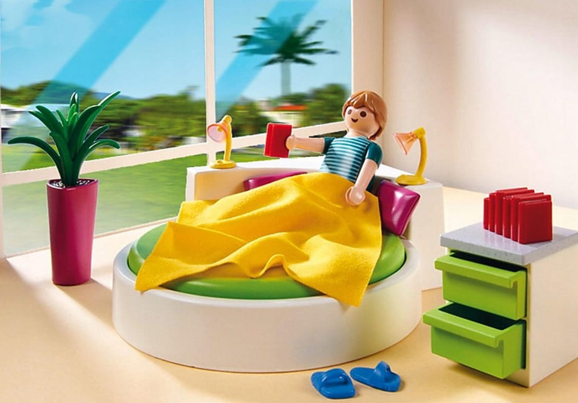 Przytulna kołdra to idealne miejsce na zwinięcie się z dobrą książką lub liczenie owiec przed snem. Zestaw zawiera jedną figurkę, łóżko, koc, poduszki, szafkę nocną, donicę, półki, książki, lampki, krzesło i inne akcesoria.