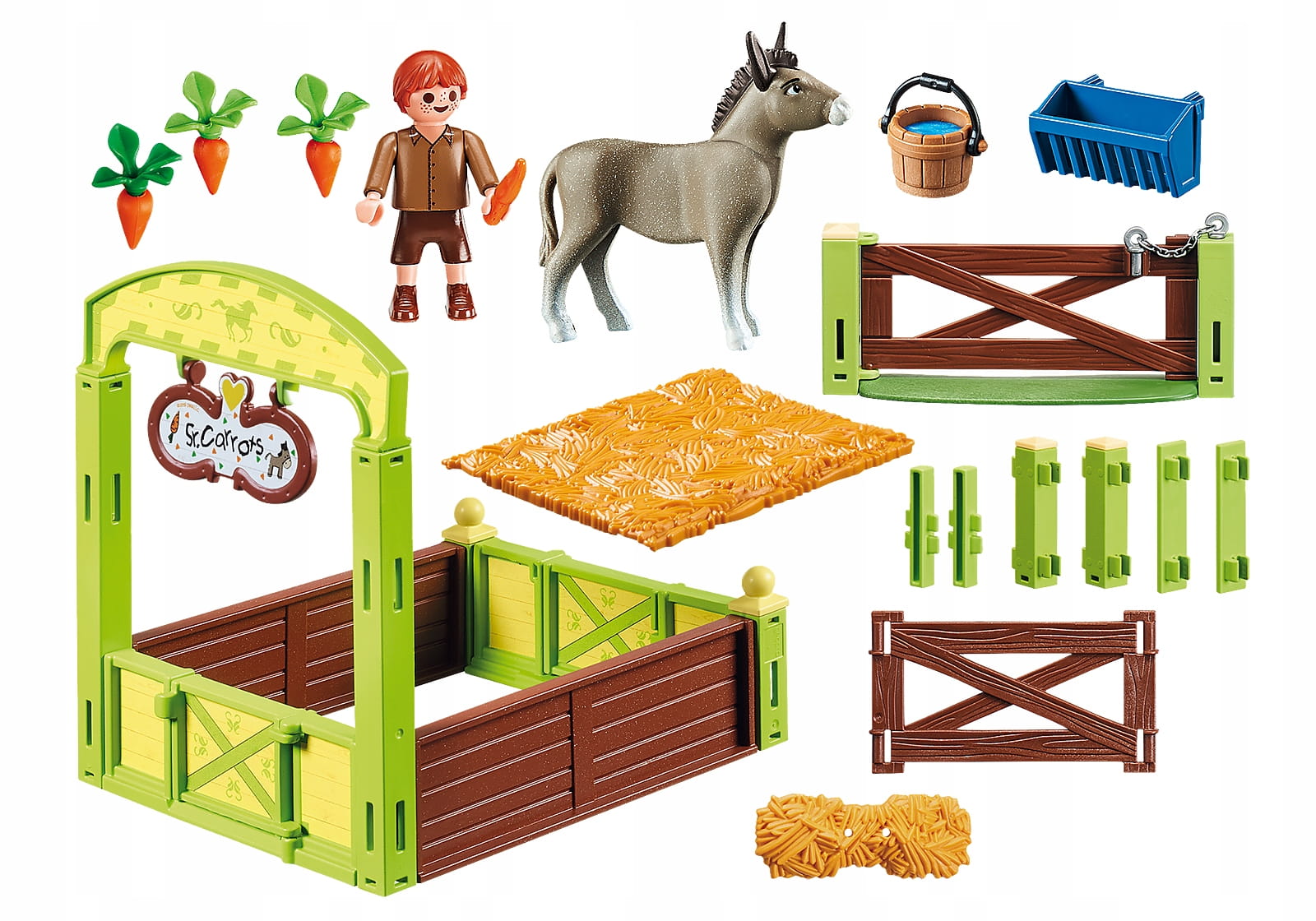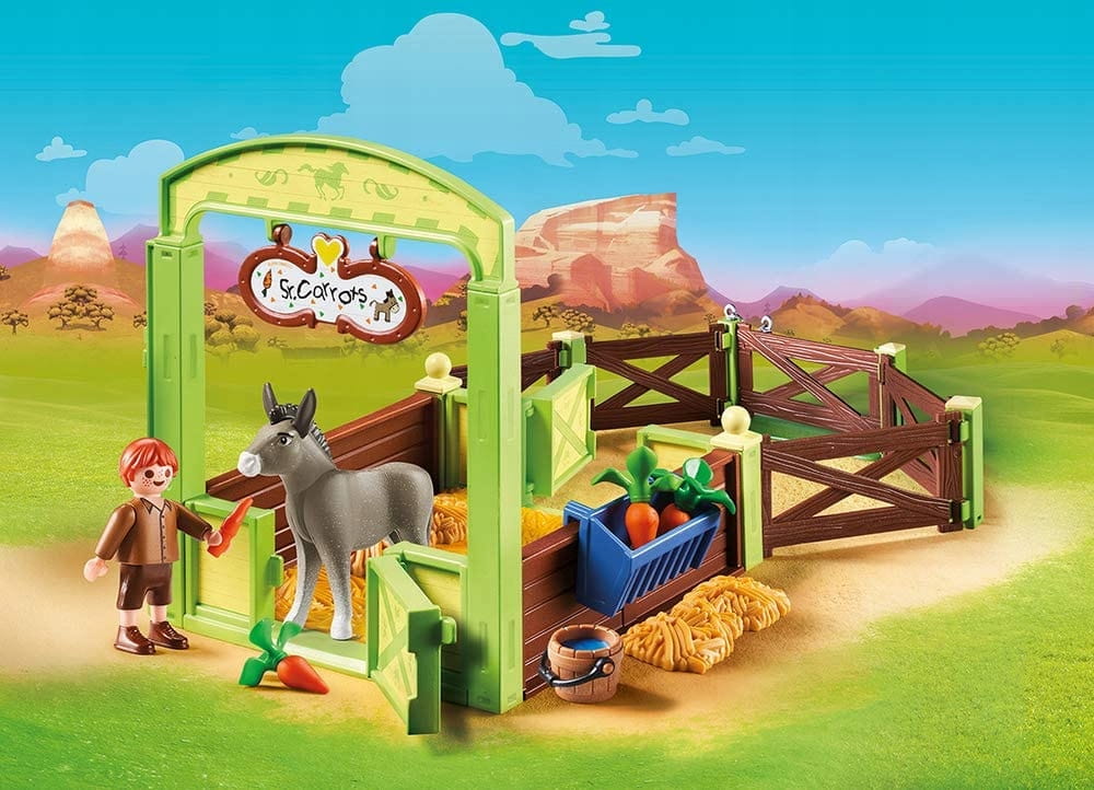 Kłak jest młodszym bratem Abigail i zawsze ma w głowie figle. Osioł Pan Marchewa jest jego stałym towarzyszem. Chociaż Klak uważa pana Marchewę za swojego najlepszego przyjaciela, osioł jest mu obojętny. Unikatowa figurka Playmobil z akcesoriami, która stanowi wspaniałe uzupełnienie serii, a tym samym daje możliwość tworzenia nowych wątków podczas zabawy. Zestaw oprócz figurki zawiera boks stajenny z elementami ogrodzenia, koryto do karmienia, marchew, siano i inne akcesoria. Możliwość rozbudowy o zestaw 70118 Boks stajenny z Lucky, Pru i Abigail (sprzedawany oddzielnie, w zależności od dostępności), a także możliwość połączenia z boksami 9478, 9479 i 9480 (sprzedawane oddzielnie, w zależności od dostępności).