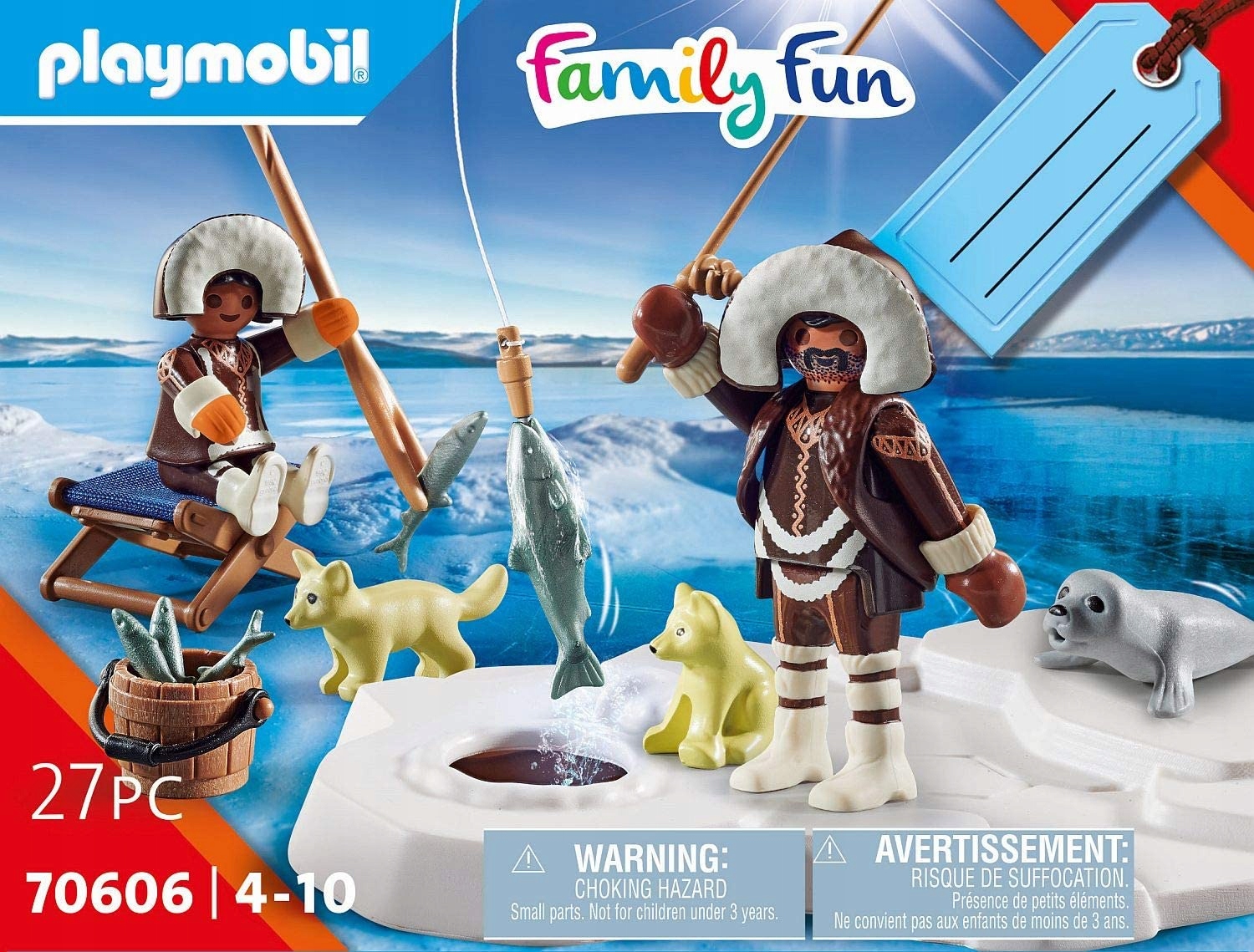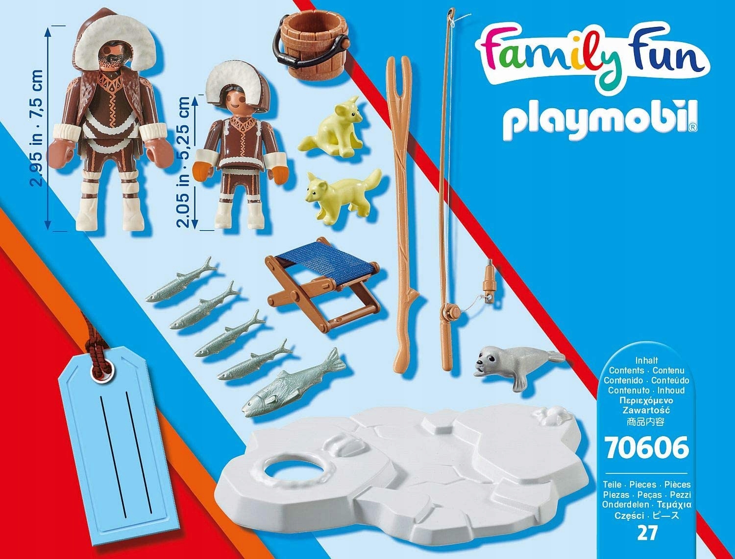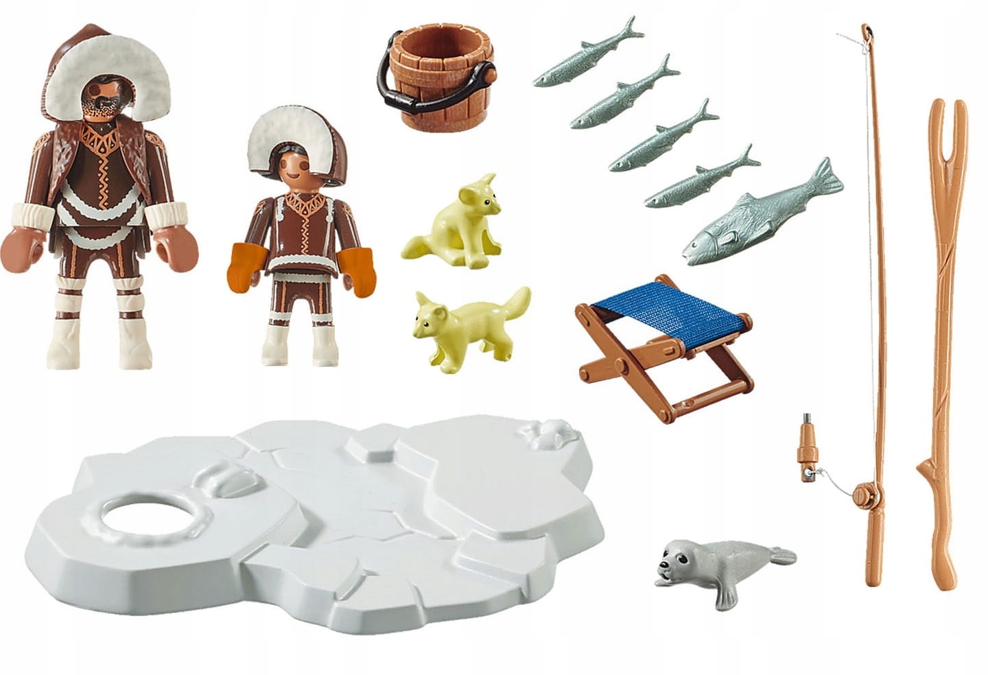 - Akcesoria: lodowa sceneria do łowienia, wędka, chwytak, taboret, wiadro.