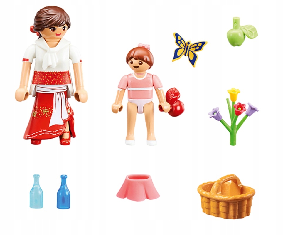 - Akcesoria: 1 kosz piknikowy, 2 butelki, 2 jabłka, 1 spódniczka dziecięca, 2 kokardy do włosów, 1 bukiet kwiatów.