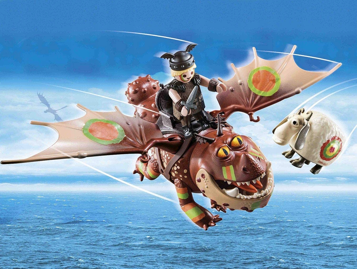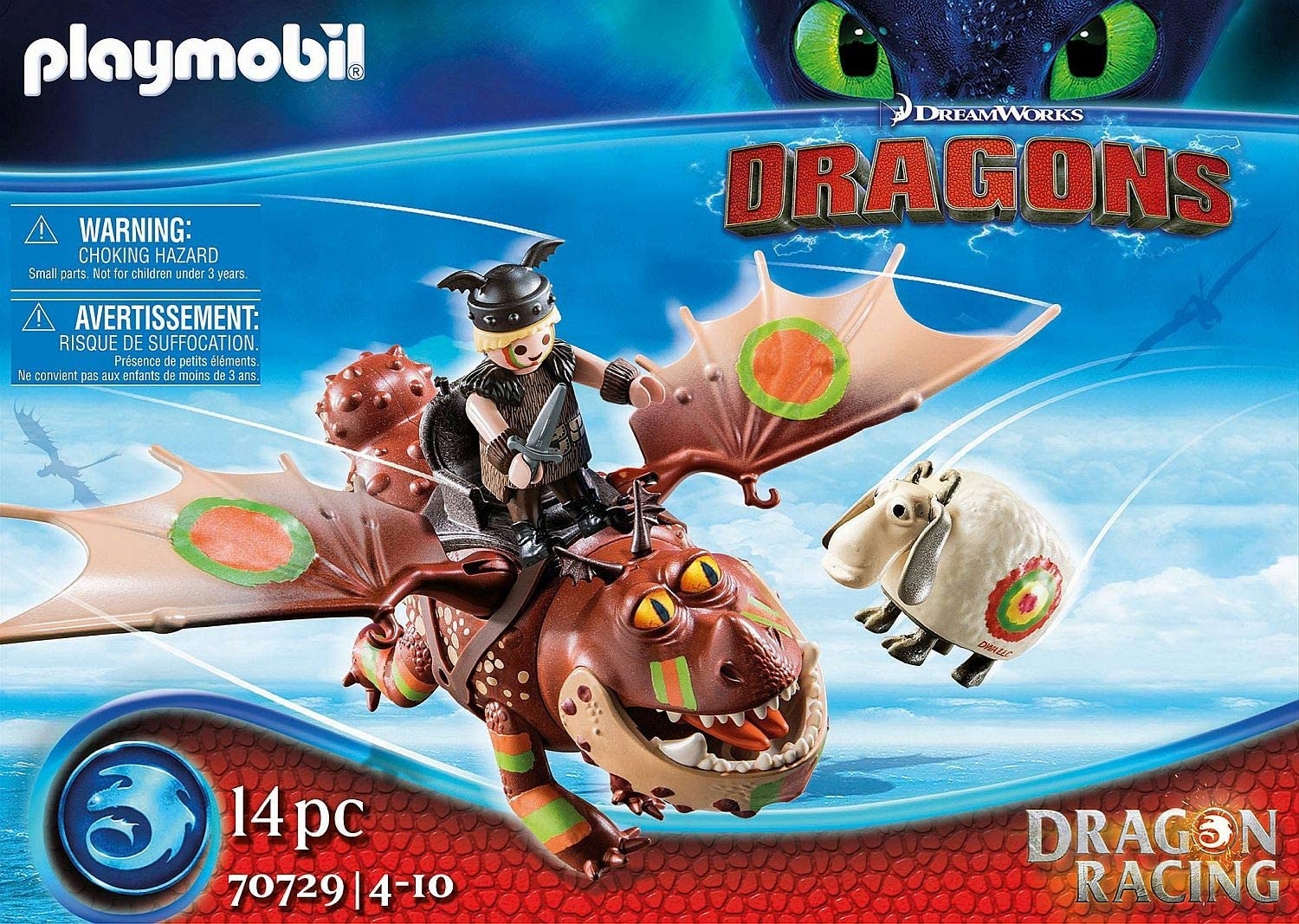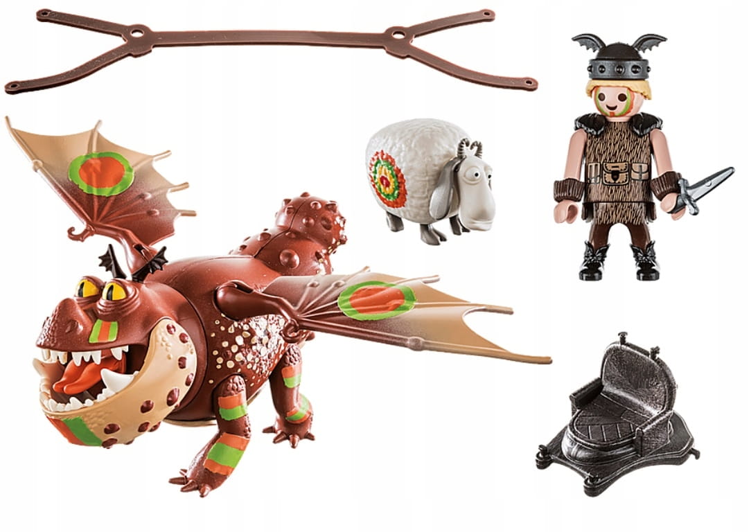 Chociaż oboje nieustannie szukają smacznego kąsku, naturalnie nie przegapią wyścigu smoków. Sztukamięs może nie jest najbardziej atletyczną smoczą damą, ale nie należy jej lekceważyć, ponieważ pomimo jej ogromnego wzrostu i krótkiej rozpiętości skrzydeł jest doskonałym lotnikiem. Ruszaj do wyścigowej zabawy! Zestaw zawiera Śledzik wikinga i Sztukamięs w wyścigowym wyglądzie, rzucającą się owcę, siodło i inne wspaniałe dodatki. Śledzik może jeździć na smoku. Siodło jest zdejmowane.