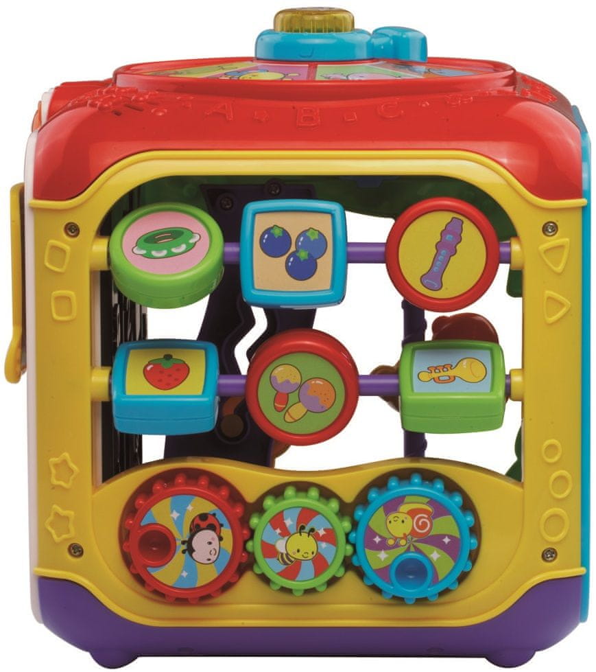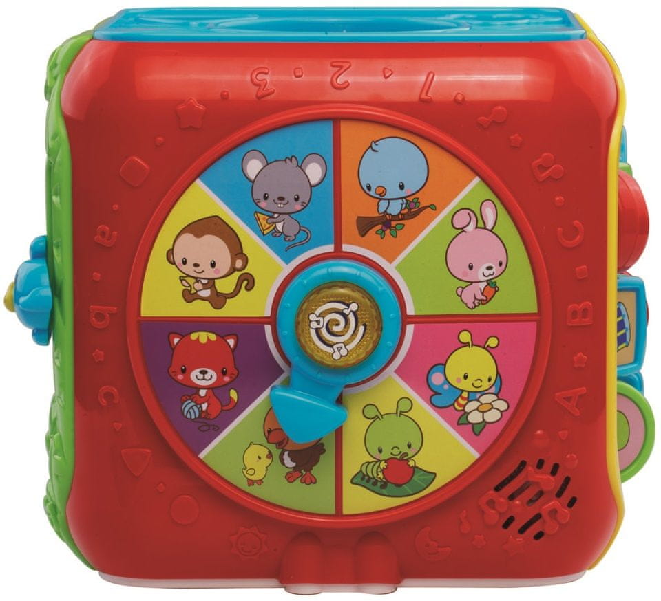 Posiada 6 kolorowych ścianek do zabawy. Pianinko uczy cyferek, kolorów i odgłosów zwierząt. Kolorowa książeczka z przewracanymi stronami wygrywa piosenki rymowanki. Ruchoma strzałka na tarczy zegara obraca się, ucząc nazw zwierząt i przedmiotów. Zabawka posiada kolorowe koraliki i zębatki oraz inne ruchome elementy, które zapewniają rozwój motoryczny małych rączek.