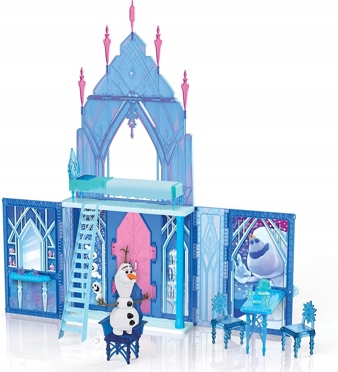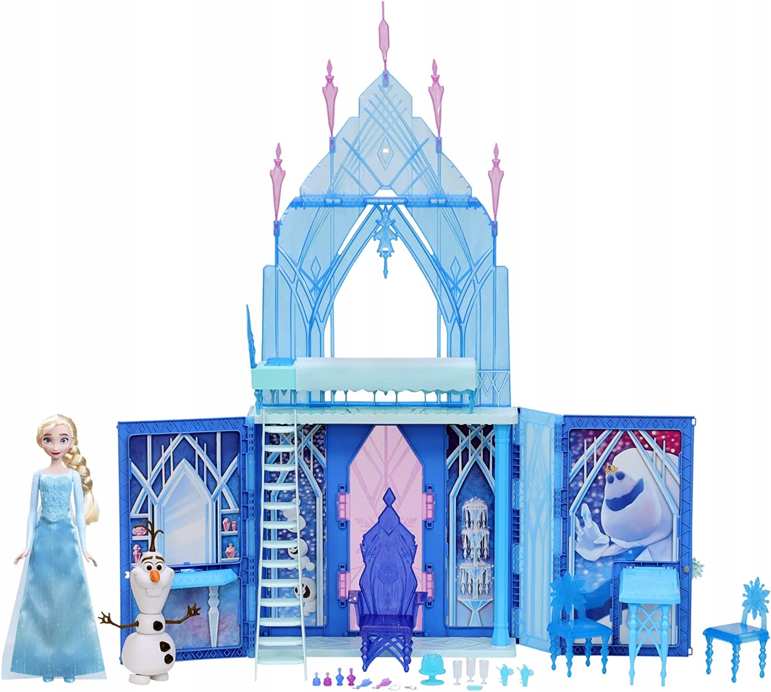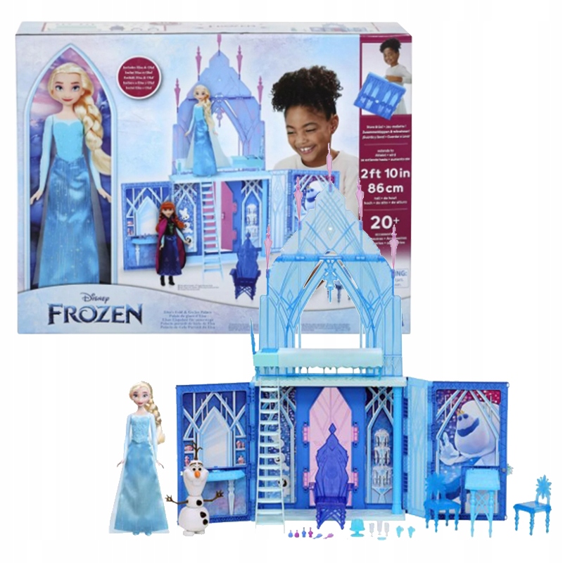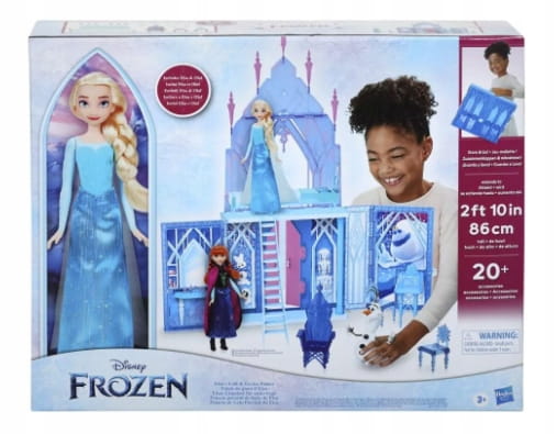 Świętowanie wszystkich niezapomnianych momentów filmowych i wyobrażanie sobie nowych przygód to dodatkowa zabawa dzięki 20 akcesoriom, w tym tronowi, łóżku, kocowi, 2 krzesłom, przekąskom, akcesoriom toaletowym, a co najważniejsze… Olafowi! Wewnątrz zamku który ma imponujące wymiary 34 na 31 cali (86 cm x 78 cm), dzieci mogą podnieść drugie piętro i złożyć stolik i toaletkę. Gdy skończą bawić się swoim zamkiem z Krainy Lodu, mogą schować w nim swoje akcesoria, złożyć go i odłożyć na następny raz… lub chwycić za uchwyt i zabrać zabawę w drogę.