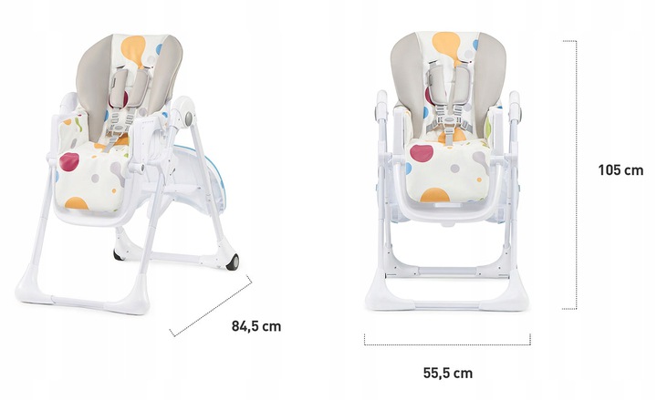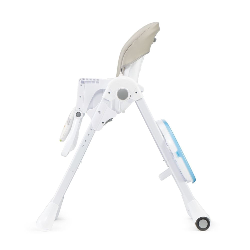 Dzięki 7-punktowej regulacji wysokości krzesełko można łatwo dostawiać do stołów o różnej wysokości. 3-punktowa regulacja oparcia, także do pozycji półleżącej, dzięki czemu może być używane przez małe dzieci. 3-punktowa, podwójna, dzięki temu łatwa do czyszczenia taca. Umożliwia wygodne posadzenie dziecka na krzesełku oraz dopasowanie odległości tacy.