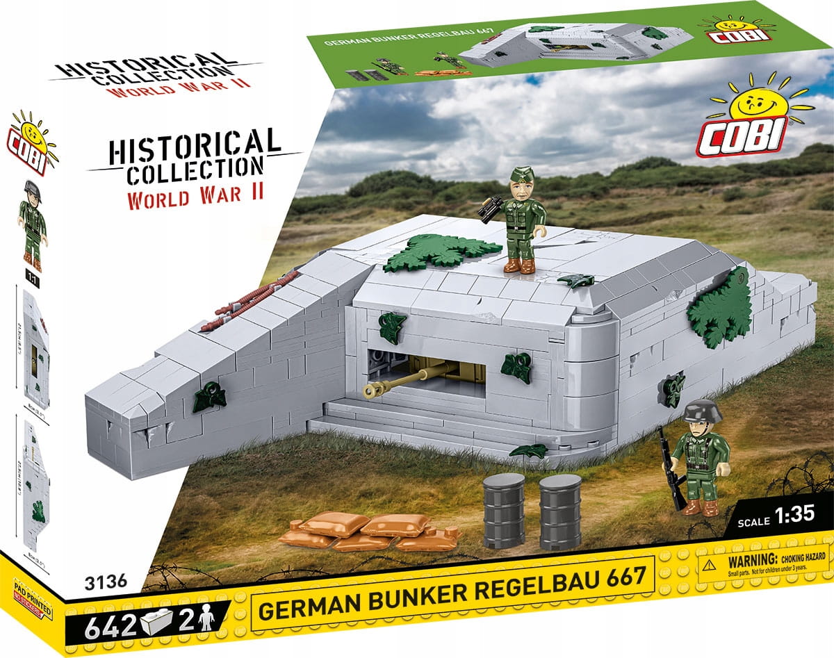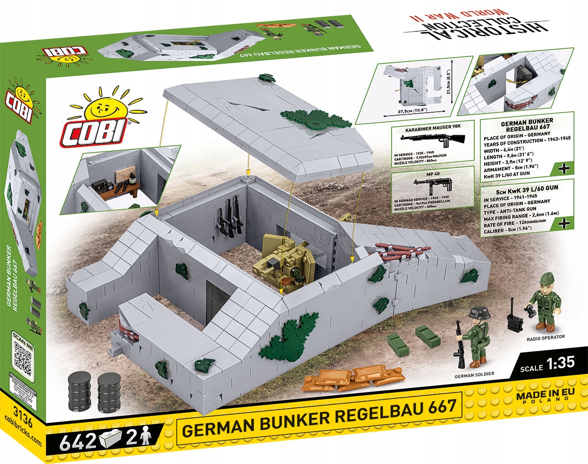 - Skala 1:35 – Bunkier Regelbau 667 w skali 1:35 zapewnia niesamowitą dokładność, pozwalając na stworzenie w pełni funkcjonalnego modelu. Schron pasuje rozmiarem do obszernej i wciąż intensywnie rozwijanej kolekcji WW2 i w sam raz nadaje się do tworzenia dioram, scenek i klockowych kompozycji z wykorzystaniem modeli i figurek COBI. Każdy element jest odwzorowany z dbałością o detale, co czyni go nie tylko doskonałym obiektem do budowy, ale również imponującą ozdobą na półce.
