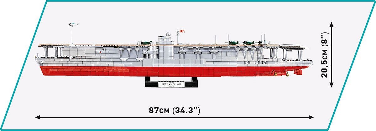 Dzięki zastosowaniu najnowszych dostępnych elementów oraz zaawansowanych technik konstrukcyjnych model możliwie wiernie oddaje proporcje historycznego okrętu i zachowuje jego wszystkie istotne elementy. Bardzo ciekawym rozwiązaniem konstrukcyjnym są dwie ruchome windy samolotowe, które możemy podnosić i opuszczać. Lotniskowiec Akagi posiada liczne ruchome części takie jak: śruby napędowe, stery, obracane wieże i lufy dział, które można podnosić i opuszczać. Na pokładzie lotniskowca może możemy ustawić 5 dołączonych do zestawu kolorowych mini samolotów z nadrukami!