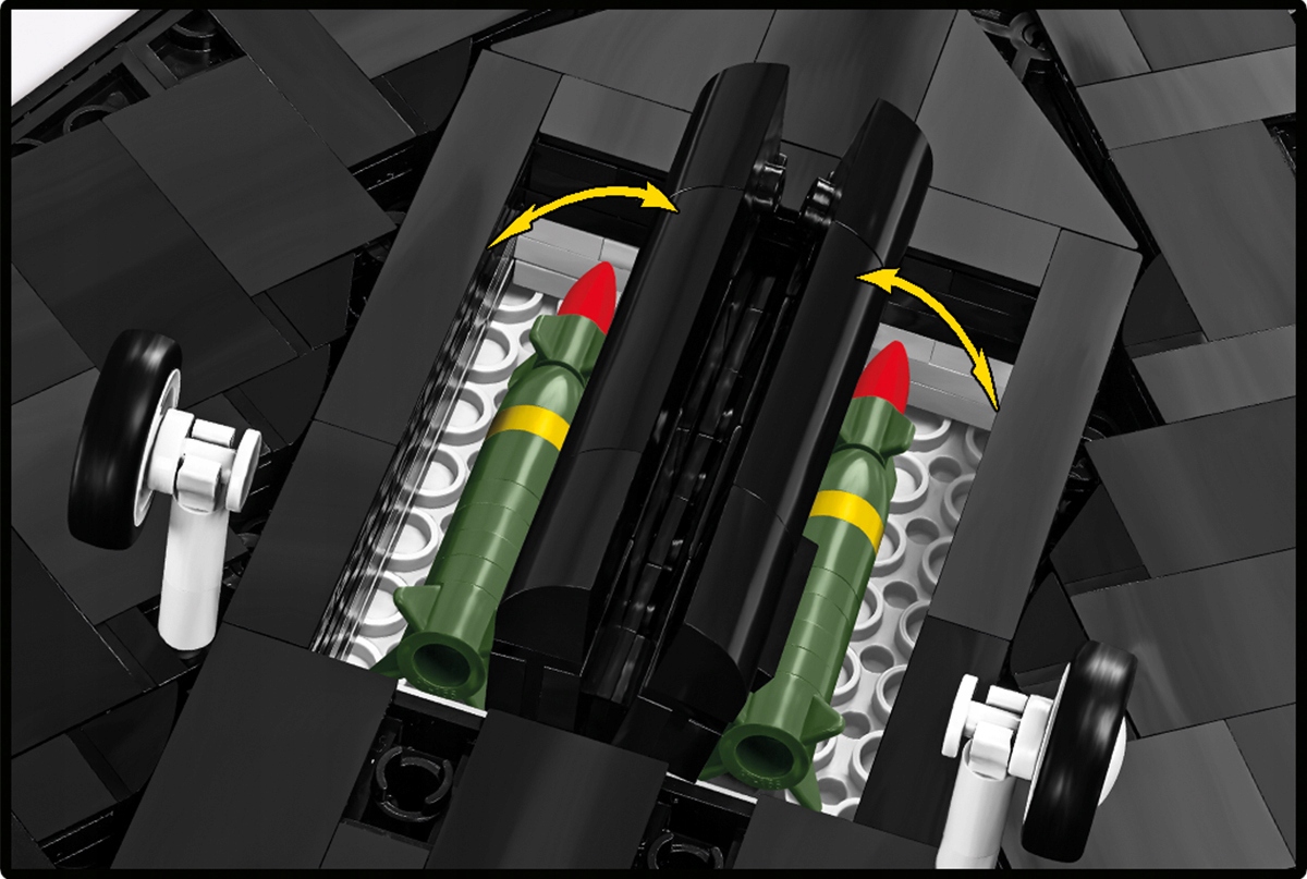 - Ruchome elementy i uzbrojenie – Model wyposażono w otwieraną kabinę, regulowane lotki, ruchome koła z gumowymi oponami oraz otwierany luk bombowy, w którym można umieścić dodane do zestawu dwie bomby typu GBU-27 PAVEWAY II – to gratka dla każdego fana precyzyjnego modelarstwa.