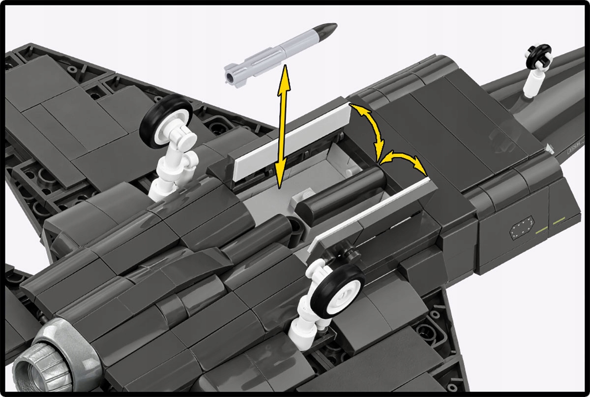 - Gumowe opony i ruchome elementy - Zestaw nie tylko wygląda świetnie, ale także oferuje pełną mobilność. Samolot ma obracane gumowe opony, otwieraną kabinę pilota, ruchome elementy sterownicze i otwierany luk bombowy.