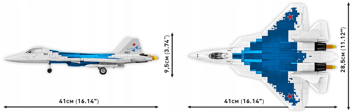 - 928 elementów - Zestaw składa się elementów, które pozwalają na stworzenie wspaniale odwzorowanego modelu samolotu. Wersja z cyfrowym kamuflażem została oparta na rzeczywistym schemacie malowania używanym na egzemplarzach Su-57 – co czyni ten zestaw nie tylko efektownym wizualnie, ale też wiernym historycznie.