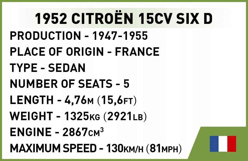 Wydany na licencji motoryzacyjnego giganta z Francji słynny samochód to kawałek historii, którą zbudujesz klocek po klocku! Citroen 15CV SIX był bez wątpienia “Królem Dróg”! Na rynku zadebiutował w 1938 roku. Jego produkcję wznowiono po zakończeniu wojny. W 1947 roku zaprezentowano model 15CV SIX D z nowym silnikiem. Do 1954 roku powstało aż 44 tysiące egzemplarzy tego modelu.