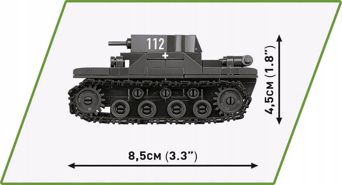 - Wymiary czołgu Panzer I (dł x wys): 8,5 cm (3.3”) x 4,5 cm (1.8")