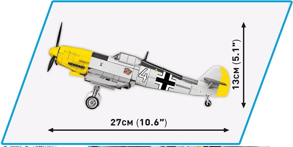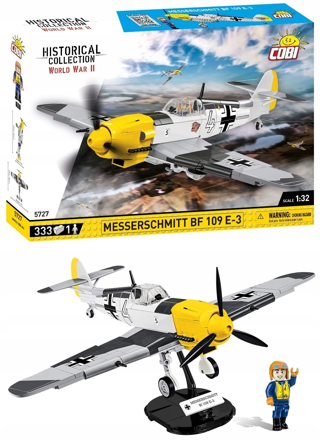 Messerschmitt BF-109 E-3 to zupełnie nowa konstrukcja dostosowana do skali 1:32. Samolot jest jeszcze większy i zawiera więcej detali odwzorowanych za pomocą 333 klocków konstrukcyjnych COBI. Samolot posiada ruchome śmigło i lotki. Jego obracające się koła z gumowymi oponami można wysunąć z podwozia w pozycji do startu lub lądowania. Kabinę pilota można otworzyć, aby osadzić za sterami figurkę, która posiada również nadruk na plecach! Samolot został pokryty wysokiej jakości nadrukami, które nie ścierają się nawet w trakcie intensywnej zabawy. W tym zestawie całkowicie zrezygnowano z naklejek. Nadruki odwzorowują malowanie i wyposażenie samolotu z okresu wojny.