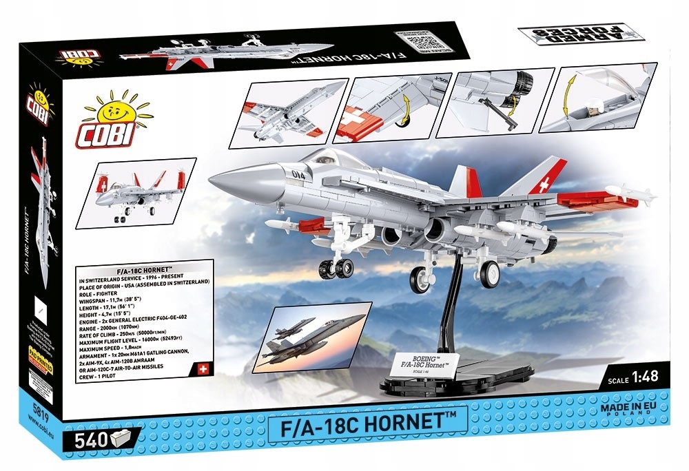 F/A-18C Hornet™ to wyjątkowy model myśliwca wielozadaniowego w barwach Szwajcarii. Samolot został przygotowany w modelarskiej skali 1:48 przy wykorzystaniu 540 klocków konstrukcyjnych COBI. W zestawie znajdziesz wysokiej jakości nadruki odwzorowujące malowanie oryginalnej maszyny. Model został wyposażony w składane podwozie i obracające się koła. Pod skrzydłami znajduje się pokaźny arsenał uzbrojenia. W kabinie możemy umieścić specjalny klocek-pilota. W zestawie znajduje się również klockowa podstawka ekspozycyjna oraz tabliczka zawierająca nazwę samolotu.