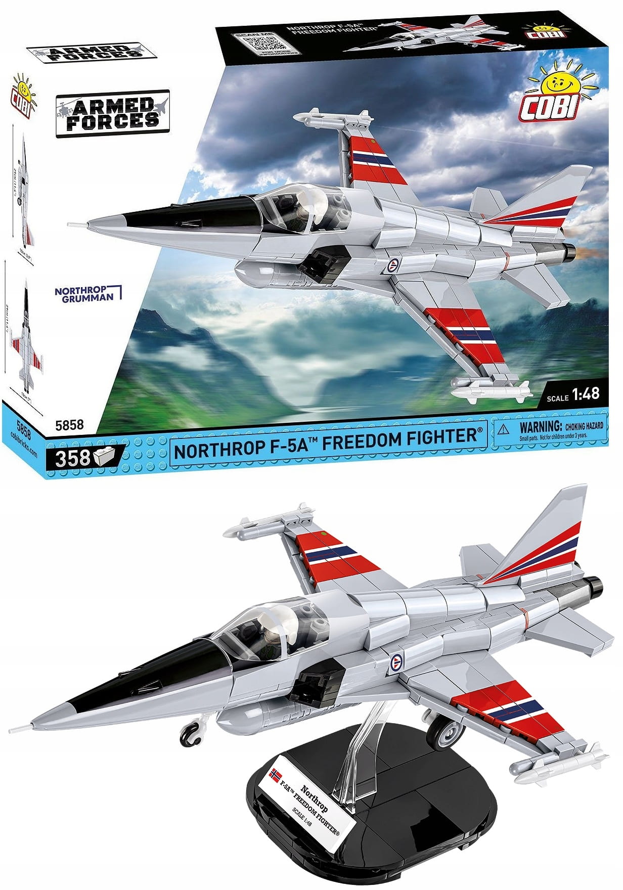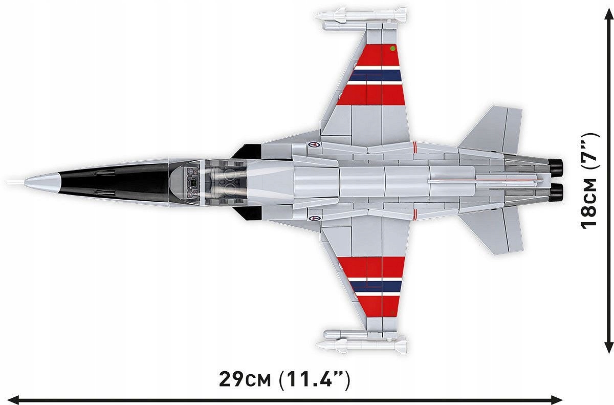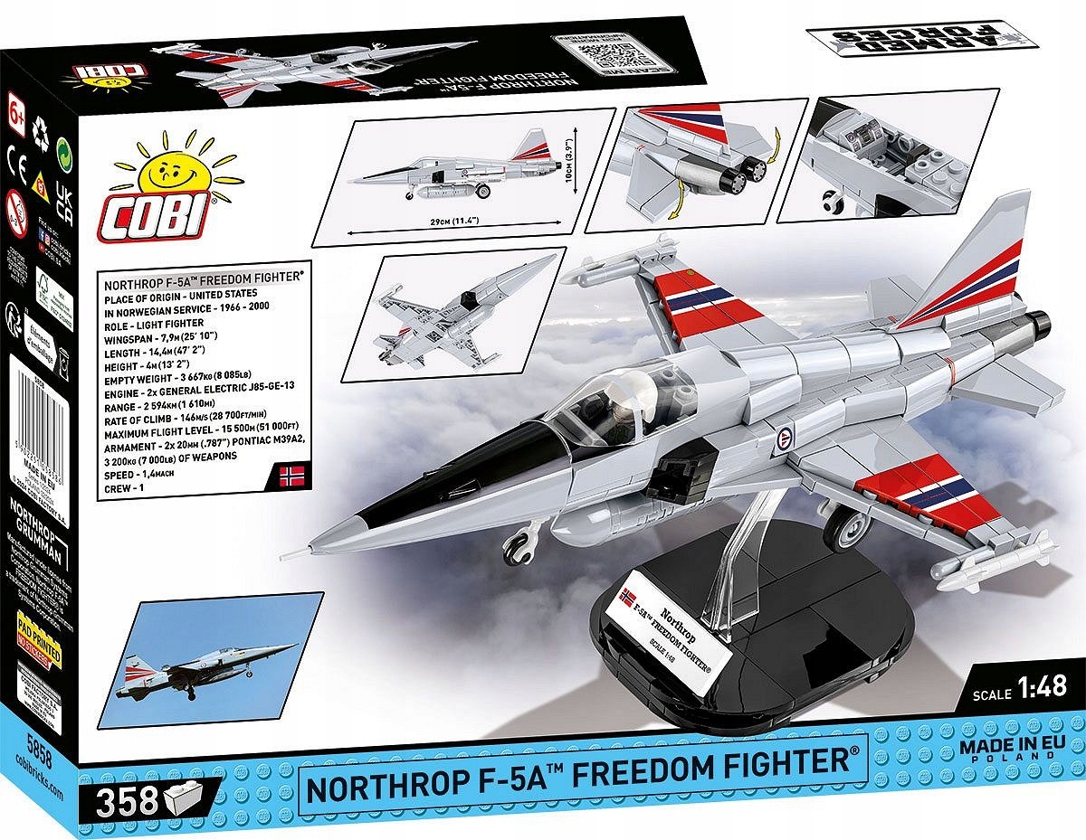 Z 358 klocków konstrukcyjnych COBI wybudujesz samolot myśliwski F-5 Freedom Fighter w przepięknych barwach Luftforsvaret (Królewskie Norweskie Siły Powietrzne).