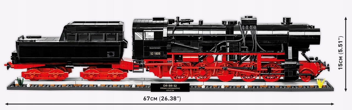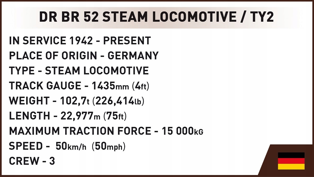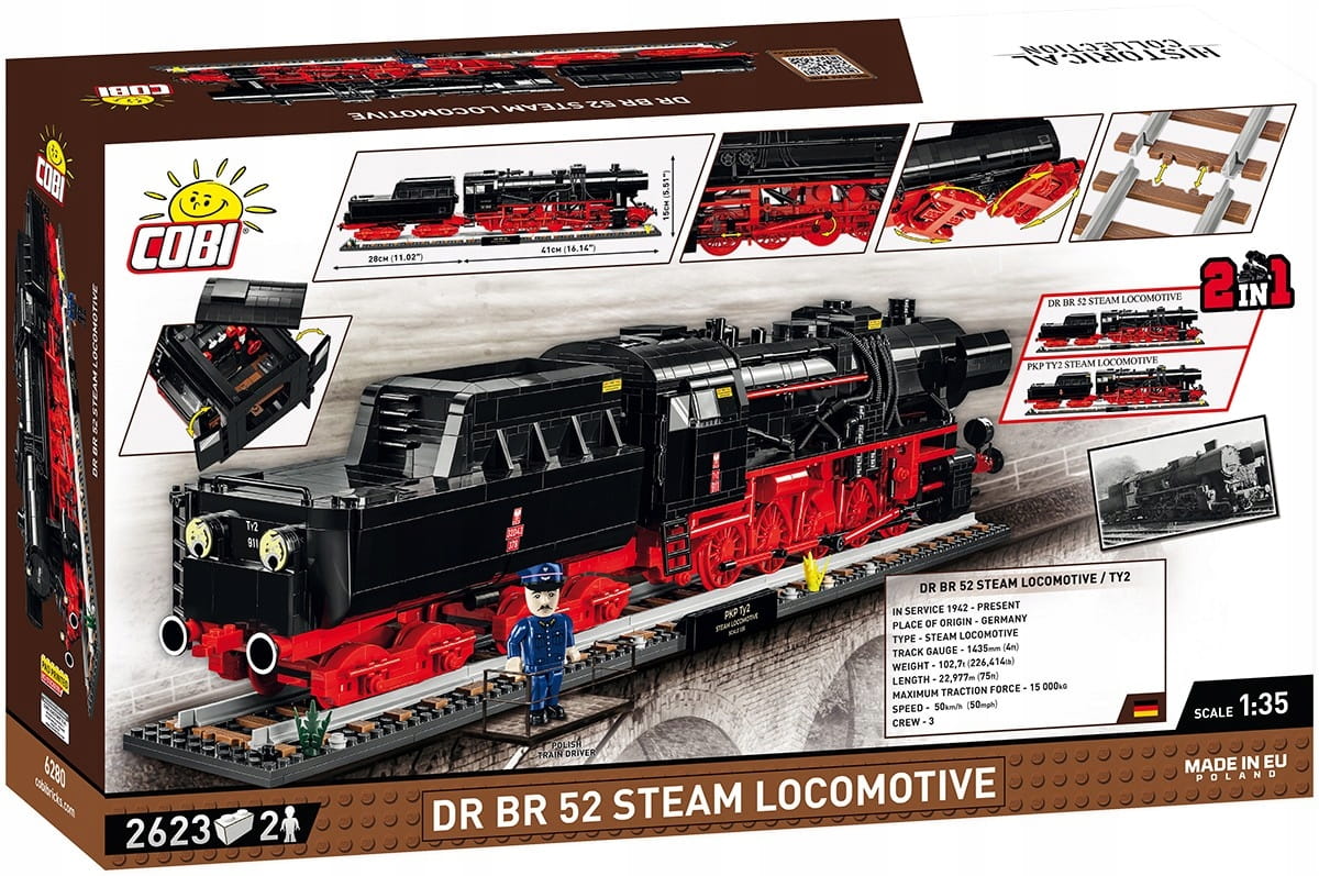 Konstrukcja z klocków wiernie odwzorowuje bryłę, proporcje i detale legendarnego parowozu, który jest chyba najpopularniejszym i najbardziej rozpoznawalnym dla wszystkich pasjonatów kolejnictwa na świecie. Ekskluzywne wydanie Executive Edition - 2 in 1 zawiera aż dwa różne komplety dodatkowych klocków, które pozwalają na zbudowanie modelu niemieckiej lokomotywy DR BR 52 z niemieckimi oznaczeniami z okresu II wojny światowej lub lokomotywy z polskimi oznaczeniami Polskich Kolei Państwowych z okresu powojennej Polski Rzeczpospolitej Ludowej.