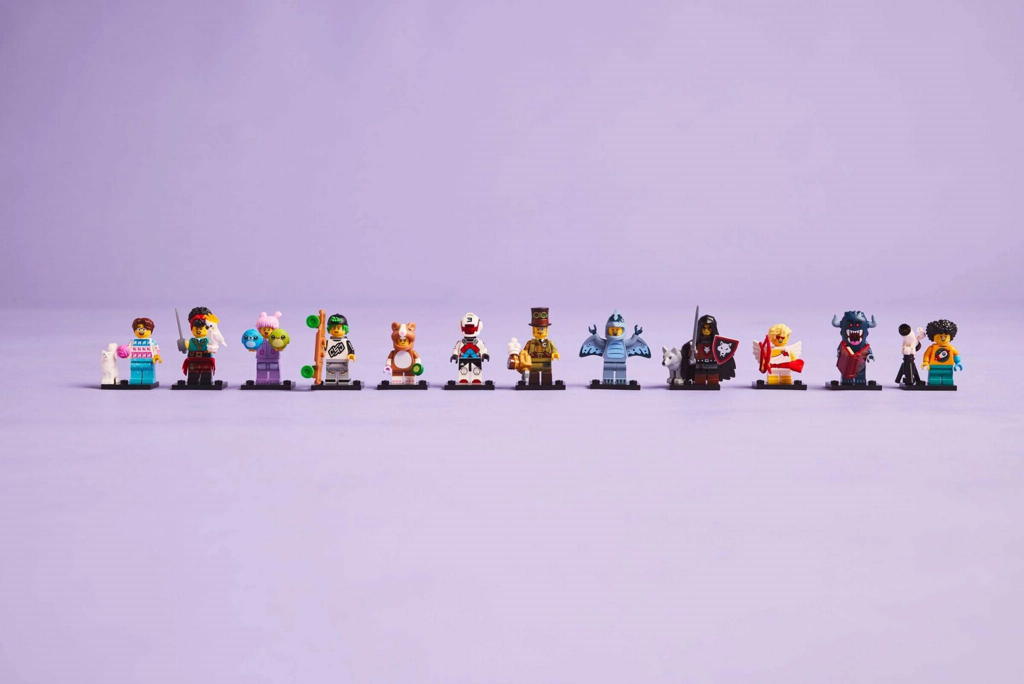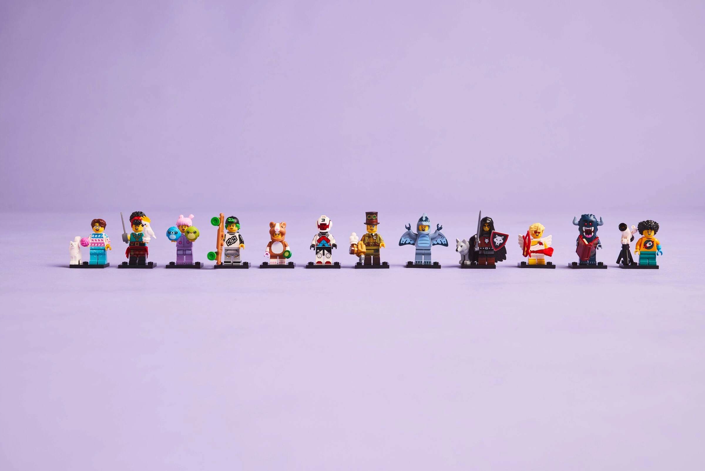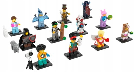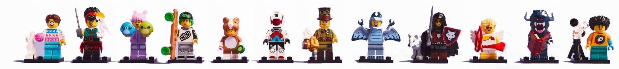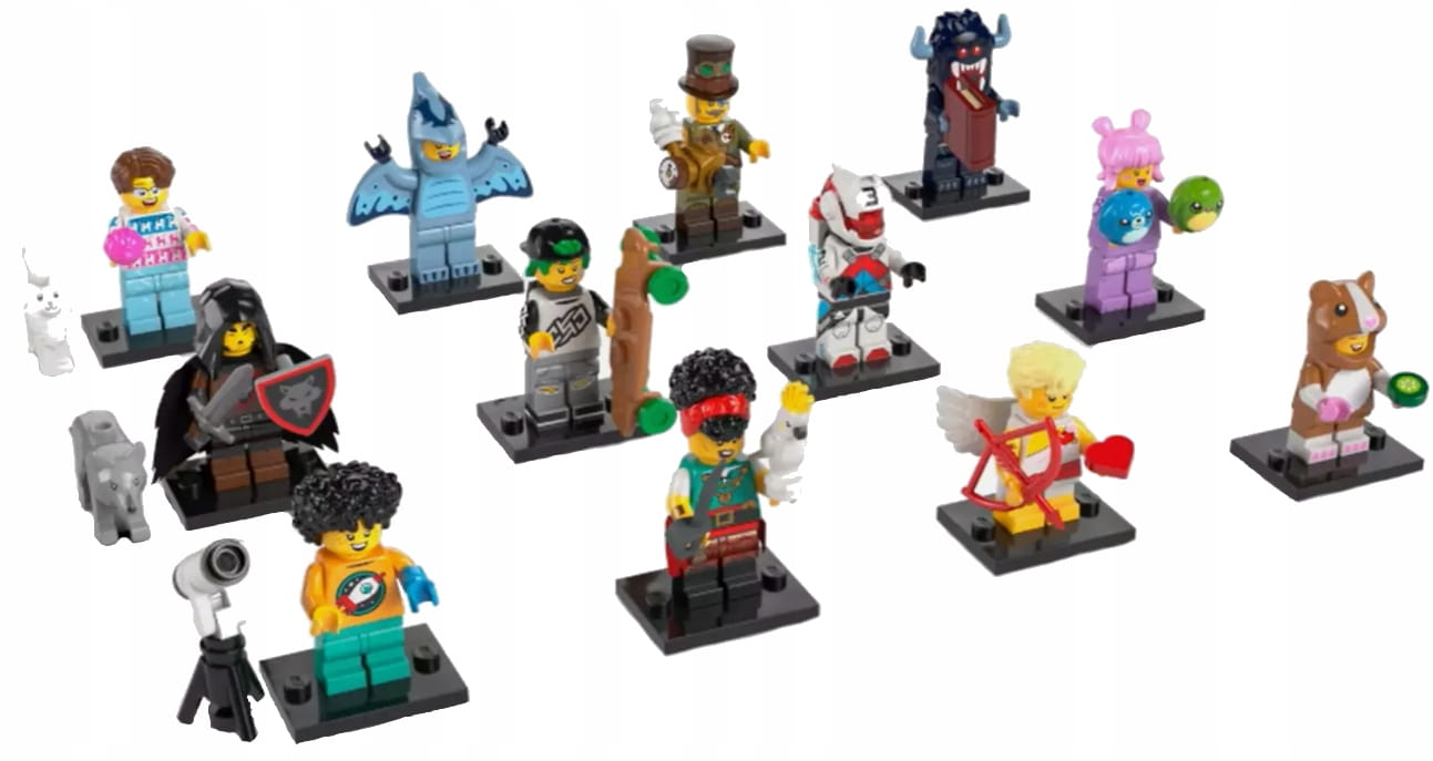 W każdym opakowaniu jest jedna z 12 minifigurek LEGO do zebrania: władca wilczego stada, piracka kwatermistrzyni, steampunkowy wynalazca, miłośnik pterodaktyli w przebraniu, straszydło, uczestnik wyścigu plecaków odrzutowych, miłośnik kotów, longboardzistka, astronomka, kupidyn, miłośniczka chomików w przebraniu i kolekcjonerka pluszaków.