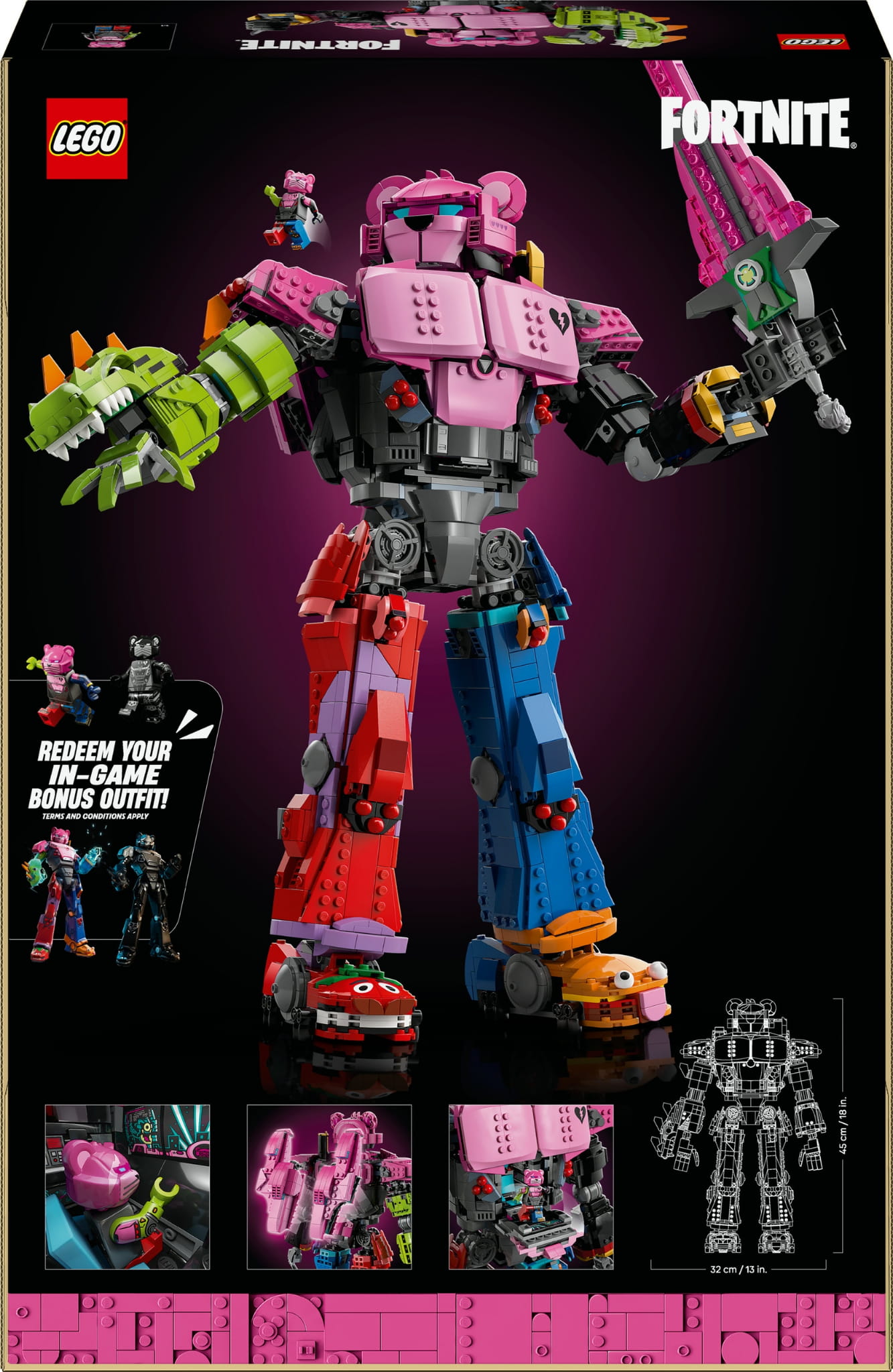 Ponadto ten zestaw zawiera cyfrowe bonusy: dwa stroje Dowódcy Drużyny Mechów i dwa stroje Mroku Drużyny Mechów, które można otrzymać w grach LEGO Fortnite i Fortnite, dzięki czemu zabawa trwa długo po ukończeniu tego modelu.