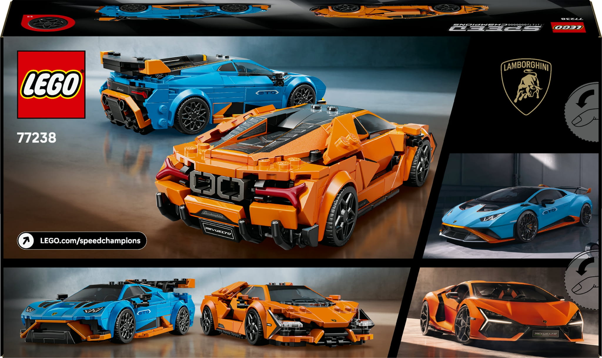 Dzieci odkryją charakterystyczny styl, inżynierię i design Lamborghini dzięki podwójnemu zestawowi LEGO® Speed Champions Lamborghini Revuelto i Huracán STO (77238).